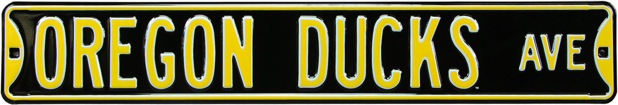 Add the black Authentic Street Signs® Oregon Ducks Avenue Sign to your home décor to be the envy of the neighborhood. Perfect for the home or office, two pre-drilled holes allow for easy hanging. An antique look is created with high quality steel and three-dimensional lettering. An automotive paint finish proudly displays your team colors. No Ducks shrine is complete without an antique street sign.
