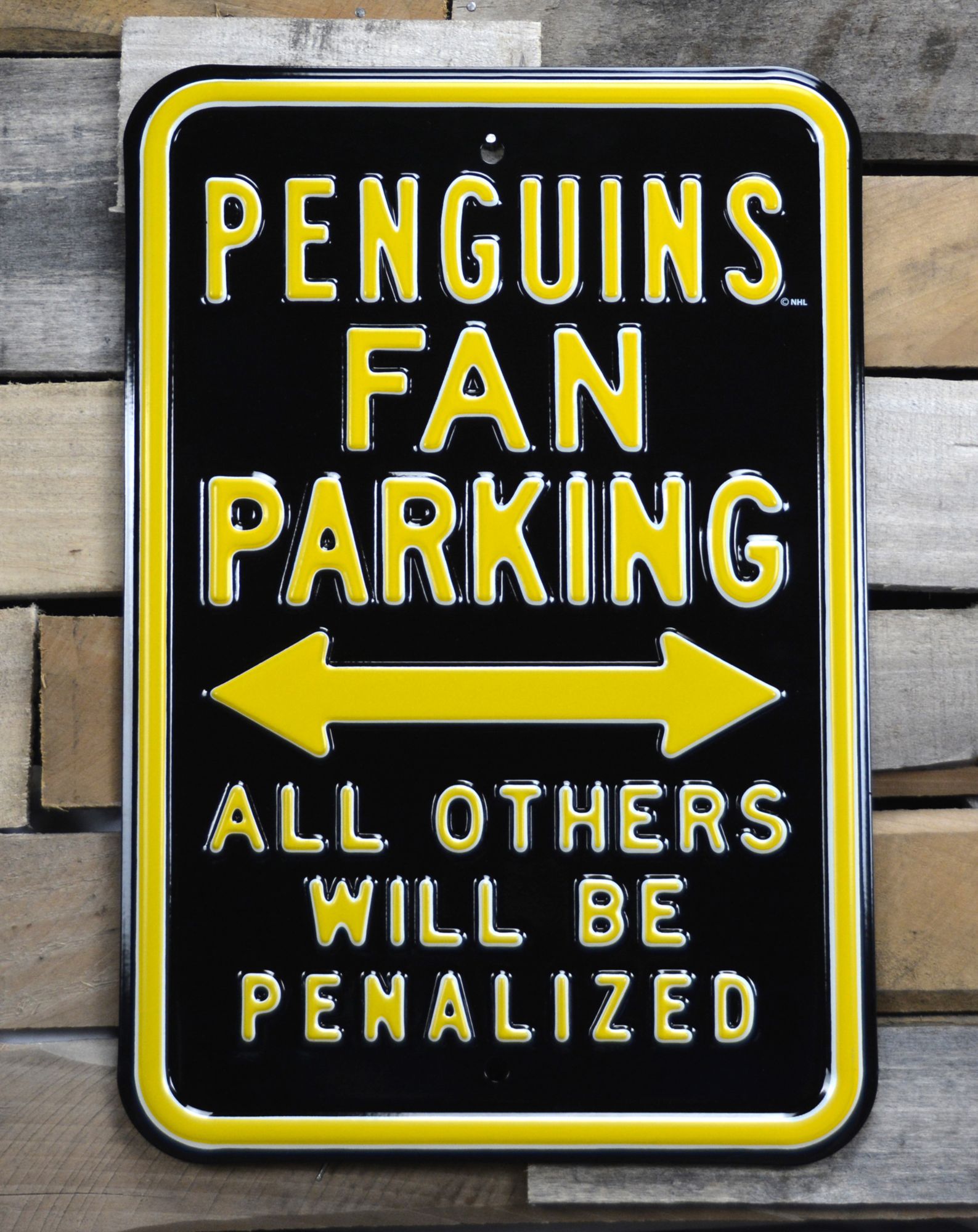 Claim a space to show your fandom with the Authentic Street Signs® Pittsburgh Penguins Parking Sign.