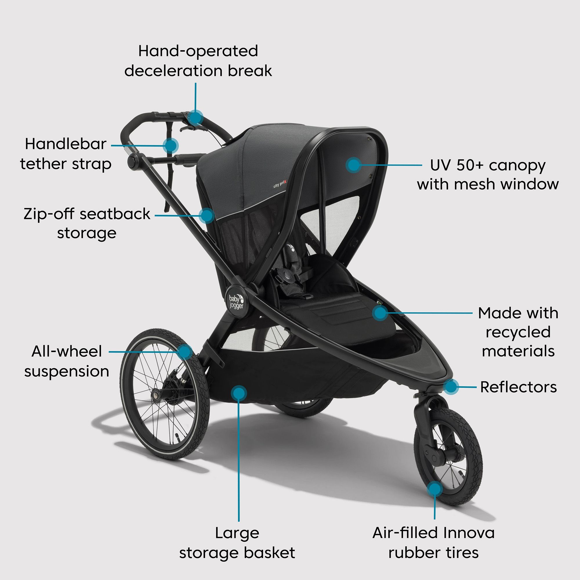 From the inventor of the jogging stroller comes the first of its kind Baby Jogger® City Prix™ Jogger x Bike Trailer: an innovative jogging stroller crossover designed for ultimate off-road experiences and can easily transition to an aerodynamic bike trailer (trailer kit sold seperately).