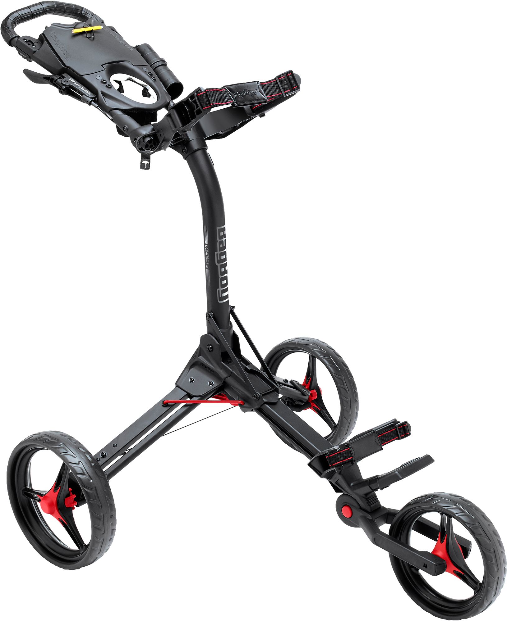 Built for superior performance and convenience, the Bag Boy® C3 Push Cart is the perfect addition to your next golf outing. The 3-wheel design features a lightweight, weather resistant aluminum frame for easy pushing, and the handle mounted parking brake provides an easy way to halt your gear. An easy one-step handle adjustment accommodates golfers of varying heights, and the three simple steps to compact this cart makes for easy storage.