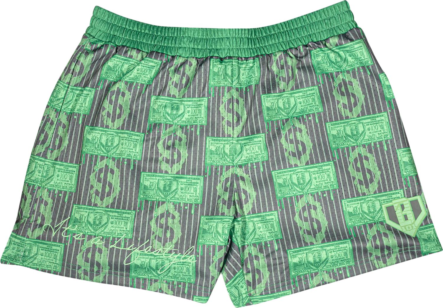 Crafted with a green background mesh and Baseball Lifestyle money print, these shorts are pretty baller! Whether you're sliding into home base or simply kicking back with your squad, these shorts will show everybody that you’re a boss.