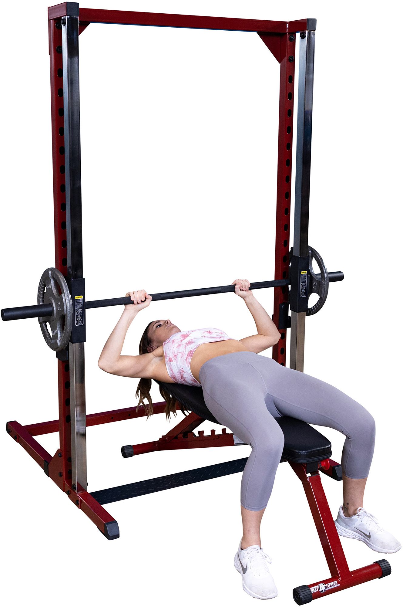 The Best Fitness BFSM250 Smith Machine is an excellent addition to any home workout, combining the power and effectiveness of free weight workouts with the safety and control of a weight machine. Lift safely without needing a spotter, thanks to the BFSM250’s safety catches. These safety catches feature 20 lockout points giving users the confidence to lift heavy without a spotter and no fear of failure. A solid steel, knurled Olympic barbell slides smoothly down the BFSM250’s carriage without resistance for safe and controlled movements. Use the 2" barbell sleeves to add up to 300 lbs. of additional weight to the barbell for intense workouts. Heavy-duty, adjustable safeties let users customize the Best Fitness Smith Machine for several of the most popular exercises, including bench presses, squats, shrugs, rows and more. Package includes Smith Machine and Folding Adjustable Bench.