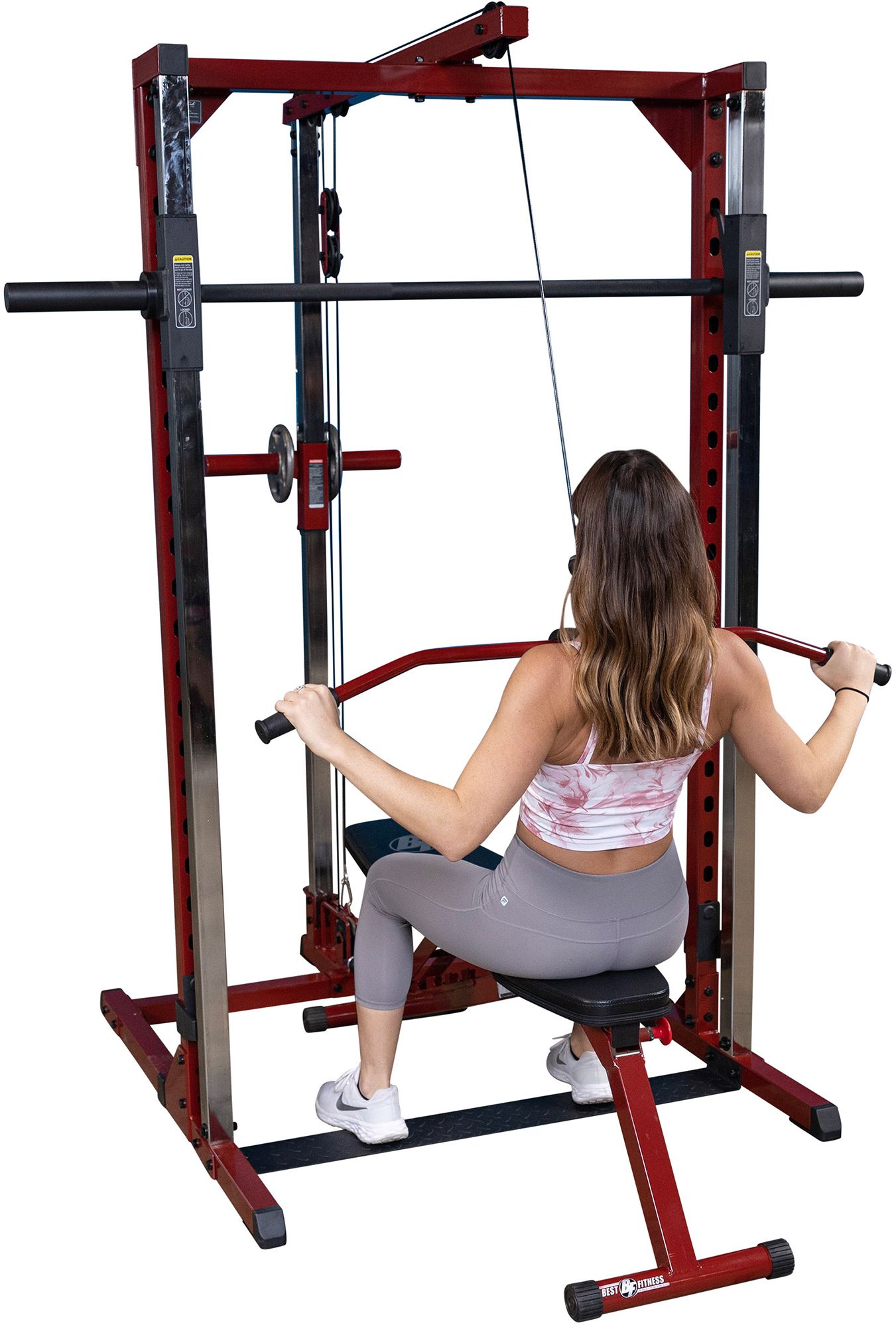 The Best Fitness BFSM250 Smith Machine is an excellent addition to any home workout, combining the power and effectiveness of free weight workouts with the safety and control of a weight machine. Lift safely without needing a spotter, thanks to the BFSM250’s safety catches. These safety catches feature 20 lockout points giving users the confidence to lift heavy without a spotter and no fear of failure. A solid steel, knurled Olympic barbell slides smoothly down the BFSM250’s carriage without resistance for safe and controlled movements. Use the 2" barbell sleeves to add up to 300 lbs. of additional weight to the barbell for intense workouts. Heavy-duty, adjustable safeties let users customize the Best Fitness Smith Machine for several of the most popular exercises, including bench presses, squats, shrugs, rows and more. Add workout variety to your Best Fitness BFSM250 Smith Machine with the BFLA250 Lat Attachment. The BFLA250 Lat Attachment allows users to perform lat pulldowns, triceps press-downs, cable crossovers, seated rows, and so much more. The BFLA250 Lat Attachment features both a high and low pulley and comes with a lat bar and low row bar. The no-cable change design allows users to switch quickly from exercise to exercise. The Best Fitness BFLA250 Lat Attachment delivers smooth and consistent resistance and features 2" weight posts for use with all Olympic weight plates.