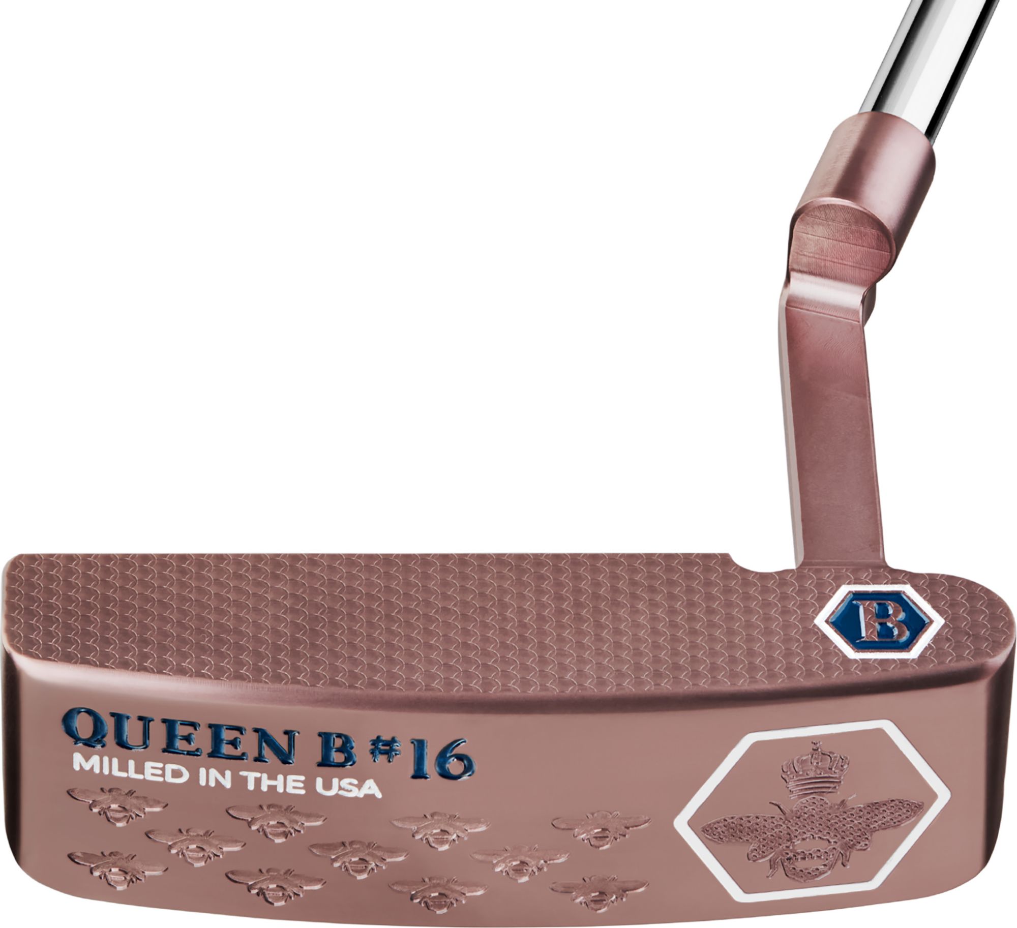 Robert J. Bettinardi elevates his traditional blade-style design with the new Queen B 16 putter. This innovative model features a traditional heel-toe weighted blade head shape with a wider flange and a crowned topline, enhancing its aesthetic charm from address. The Center of Gravity is positioned in line with the flange alignment, contributing to the putter's stability and performance, while the chamfered bumpers add to the allure of this refined design. The Mini Honeycomb™ Face Milling enhances the putter's performance with an 8% smaller machining tool, resulting in the softest Honeycomb™ face to date, while beautifully highlighting the unique design. Each head in the Queen B Series is completed in a new Royal Rose PVD finish and crafted from one-piece milled 303 Stainless Steel, the same high-quality material favored by Bettinardi Tour staffers worldwide. This exquisite craftsmanship provides exceptional durability, responsiveness, and a solid feel, ensuring supreme performance on the green.