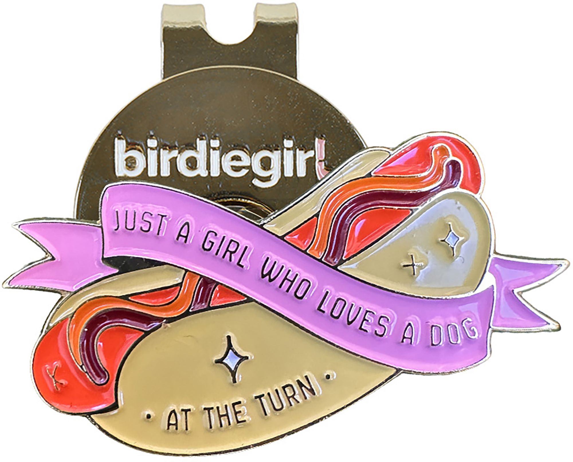 If you're the type who looks forward to that hot dog at the turn just as much as the back nine, this one's for you! Featuring a vibrant hot dog wrapped in a pink banner that reads "Just a Girl Who Loves a Dog at the Turn," this golf ball marker captures your love for both golf and snacks. It’s the perfect mix of fun and sass to show off your personality on the course.