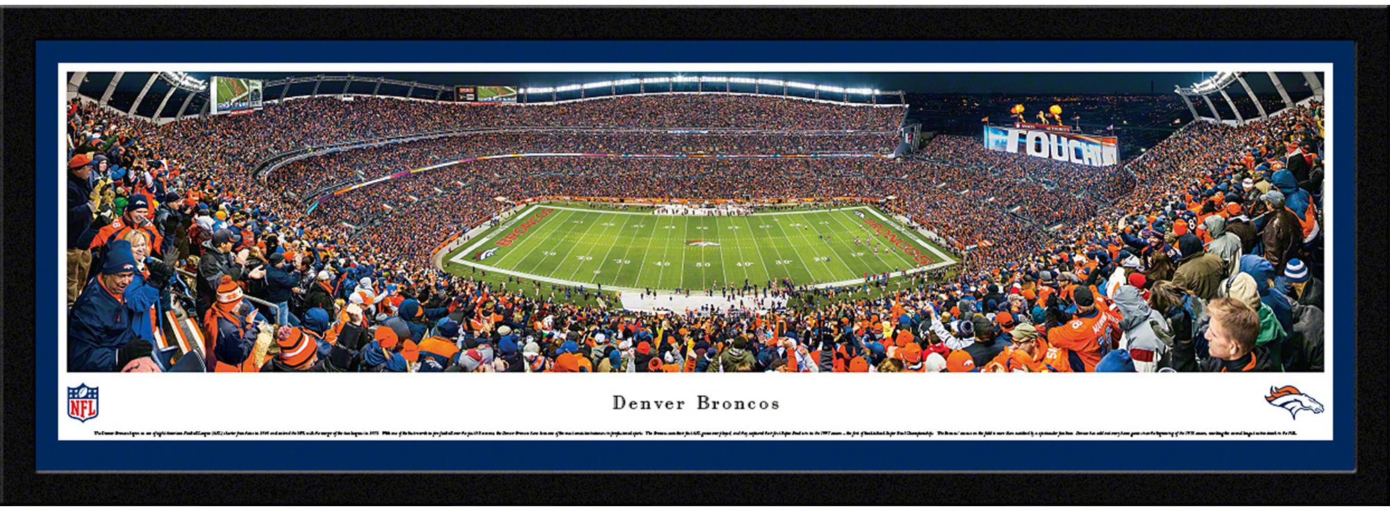 Add the perfect piece of team spirit to your home, office, or den with the high-resolution Blakeway Panoramas® Denver Broncos Framed Panorama Poster.