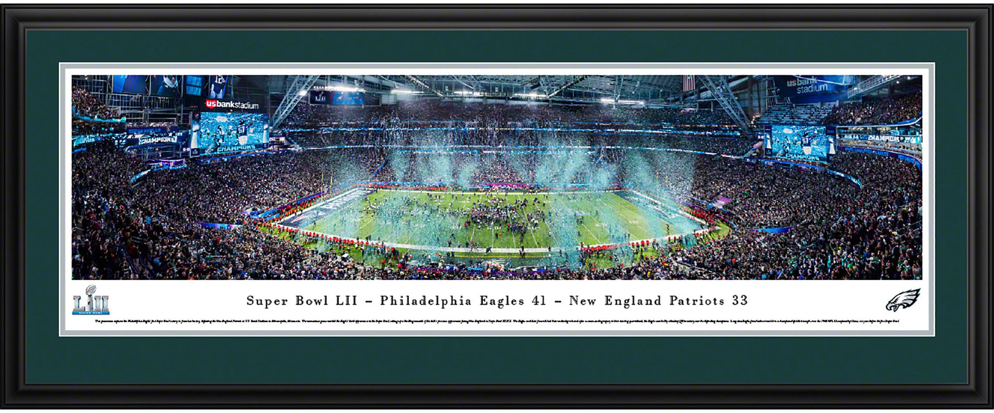 Add a piece of Super Bowl® history to your home, office, or den with the high-resolution Blakeway Panoramas® Super Bowl® LII Champions Philadelphia Eagles Deluxe Framed Panorama Poster.