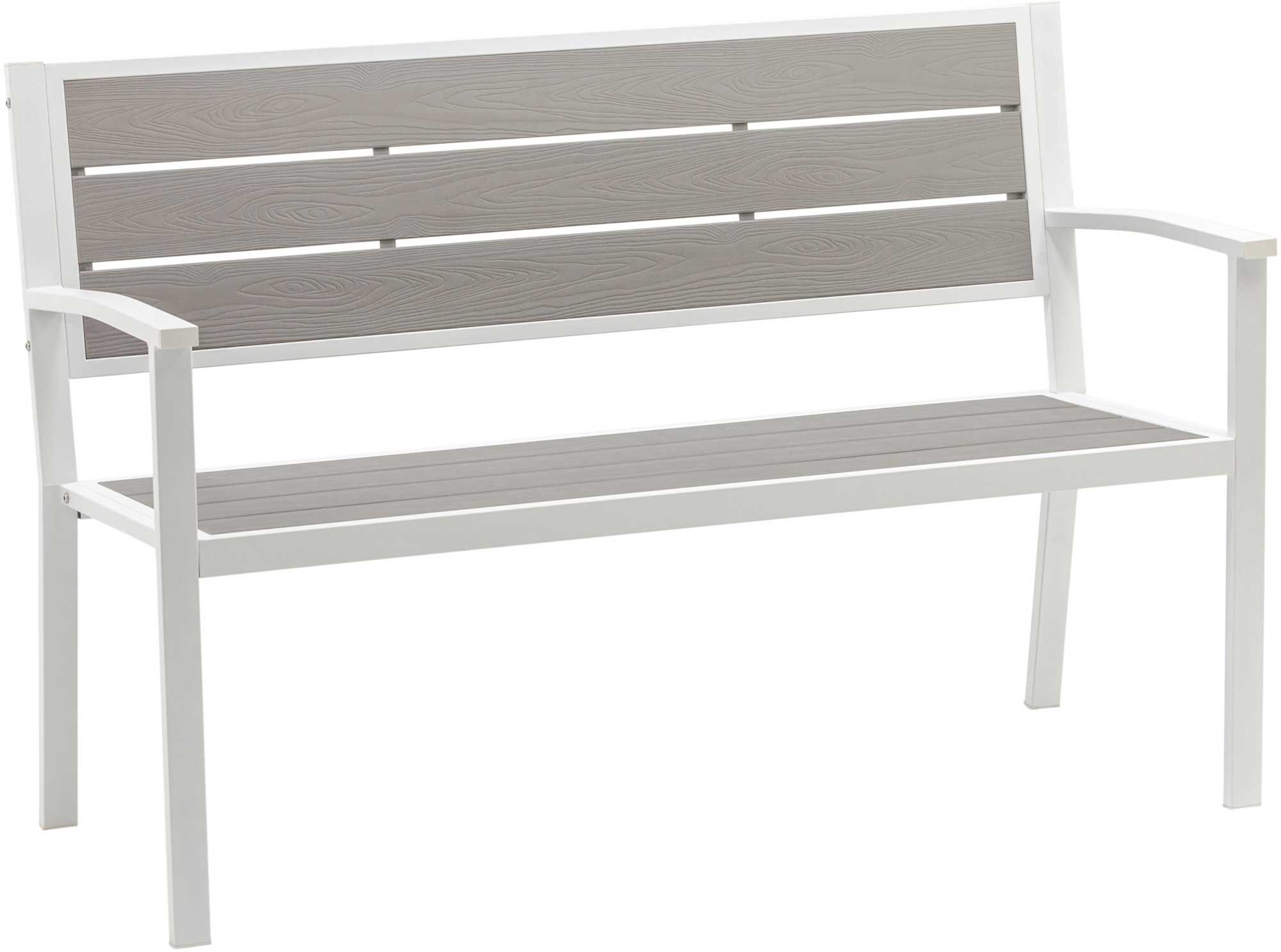 Made from durable poly-resin lumber, an improvement on wood, with inability to splinter, crack, chip, peel, or rot, retaining smooth, pretty surface and straight-out-of-the-box appearance, featuring water and UV resistant surface with a modern stainless steel frame, surviving long-term use with strength
