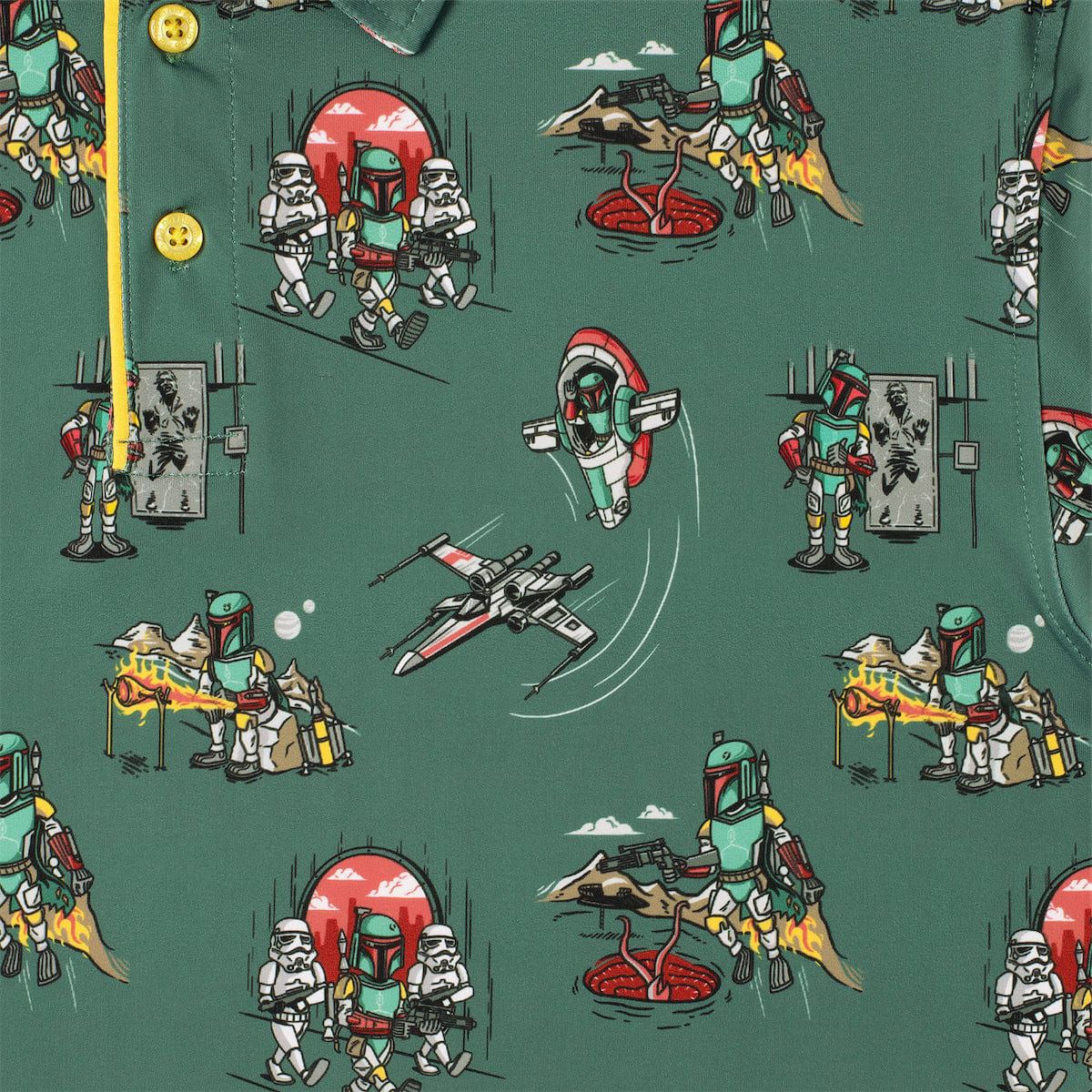 A polo that would make any bounty hunter set their helmet aside. Remove your armor and slip into a comfortable polo printed with Boba Fett’s best escapades, in case you need inspiration after the 18th hole.