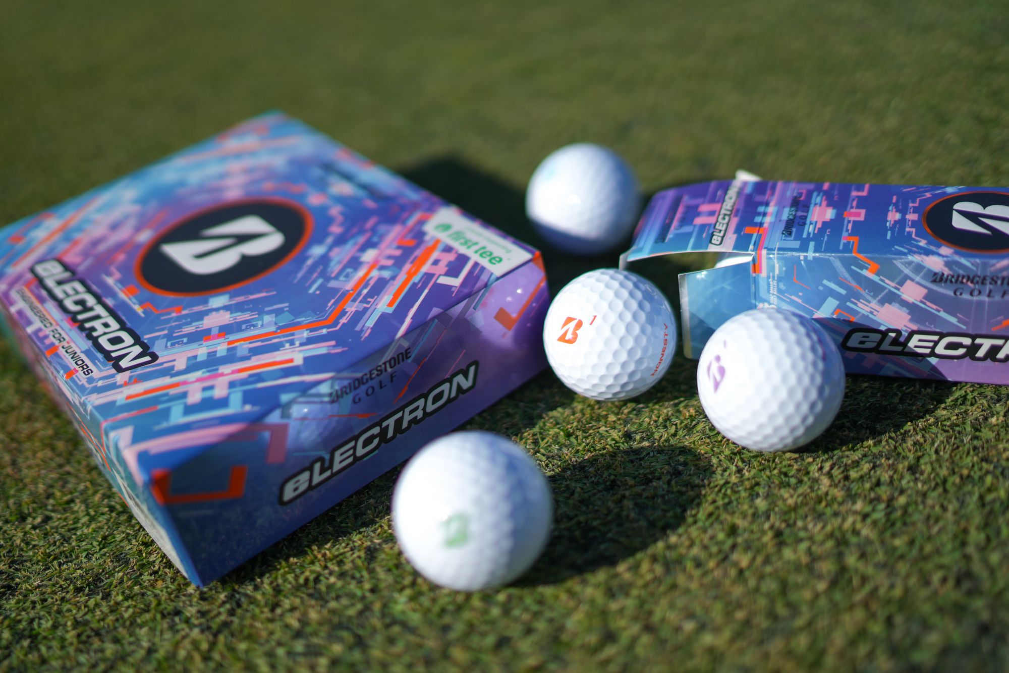 Technology inside the ball to help junior play better, reminders on the ball to teach juniors better etiquette. Within each dozen there are 4 unique golf balls: 3 balls with purple markings that say 'KINDNESS', 3 balls with orange markings that say 'HONESTY', 3 balls with green markings that say 'CHARACTER', and 3 balls with blue markings that say 'RESPECT'