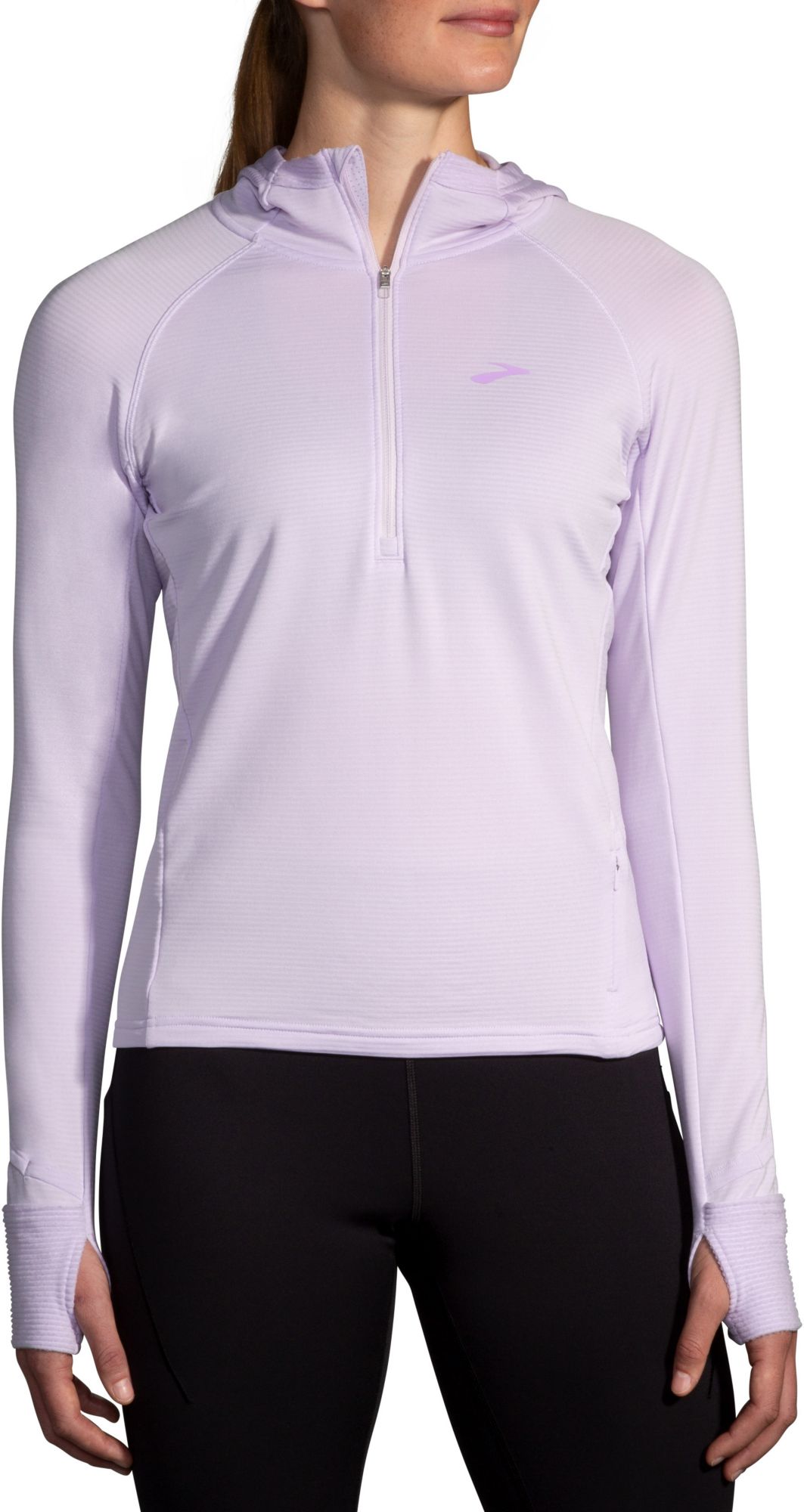 Love this hoody for cool, windy, or rainy runs. It’s very soft and warm! I wore it on my first 50K and it was incredibly comfortable. The sleeves are long enough for the thumb holes and the pull over hand warmers are nice if you didn’t bring gloves.