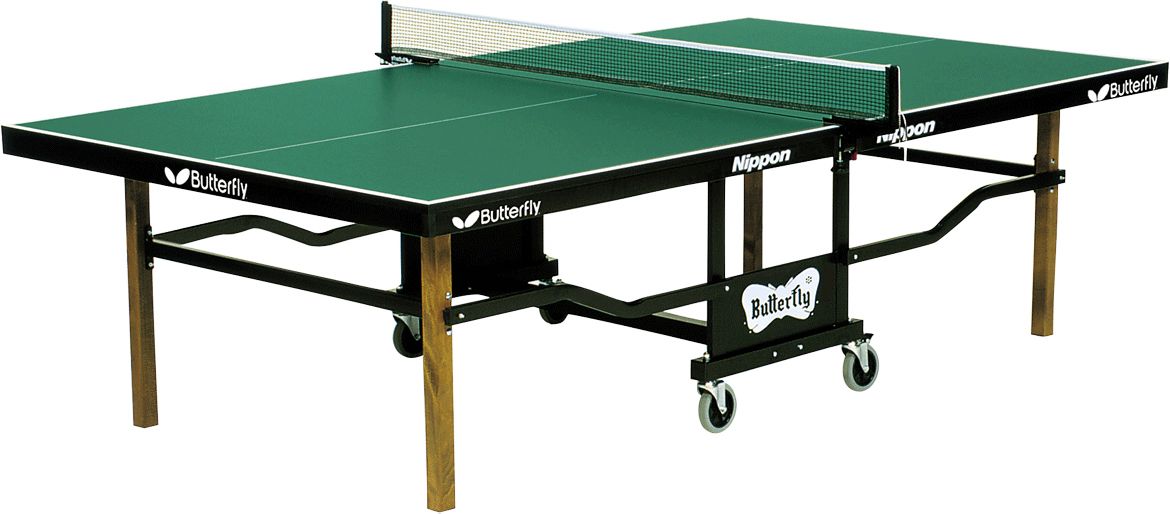 The Butterfly Nippon Rollaway Table is built with durable materials to withstand constant folding and unfolding. Square wood legs provide a classic look while 5’’ ball bearing wheels allows you to easily roll in and out of storage. This table comes complete with a national league net set.