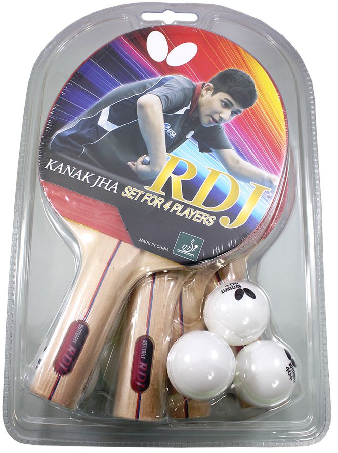 Improve your table tennis game with the excellent control capabilities of the Butterfly RDJ 4-Player Table Tennis Racket Set. This set includes four wooden rackets with black and red Addoy rubber that feature a straight handle and shakehand grip. It also includes six poly table tennis balls, so you can grab some friends and get playing.