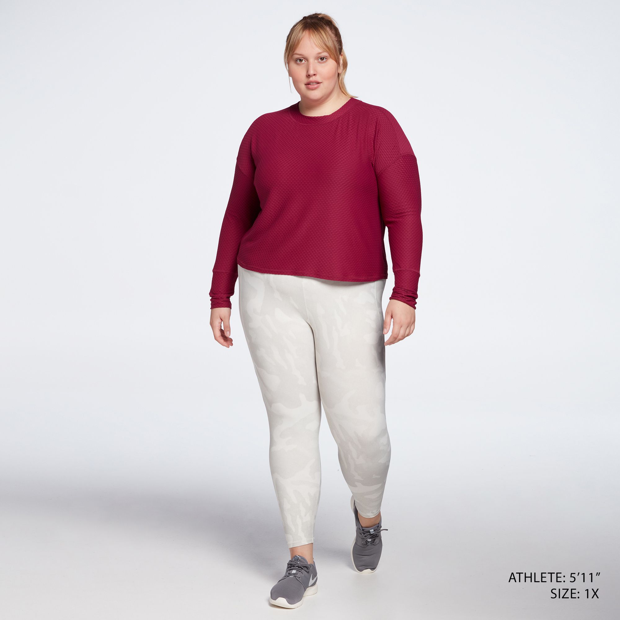 Bought this shirt online and it looks like it has been worn several times at least. Several snags on one of the sleeves and item was visibly unclean. Item did not have original Calia tags on it. Very disappointed that Dicks would send this out as a new, undamaged and unworn item. To be fair every other item in my order in the CALIA collection was in fine condition with this exception. This shirt is cropped. Doesn't run quite as large as some CALIA tops/sweatshirts do. I have this top in several other colors and wear them often.
