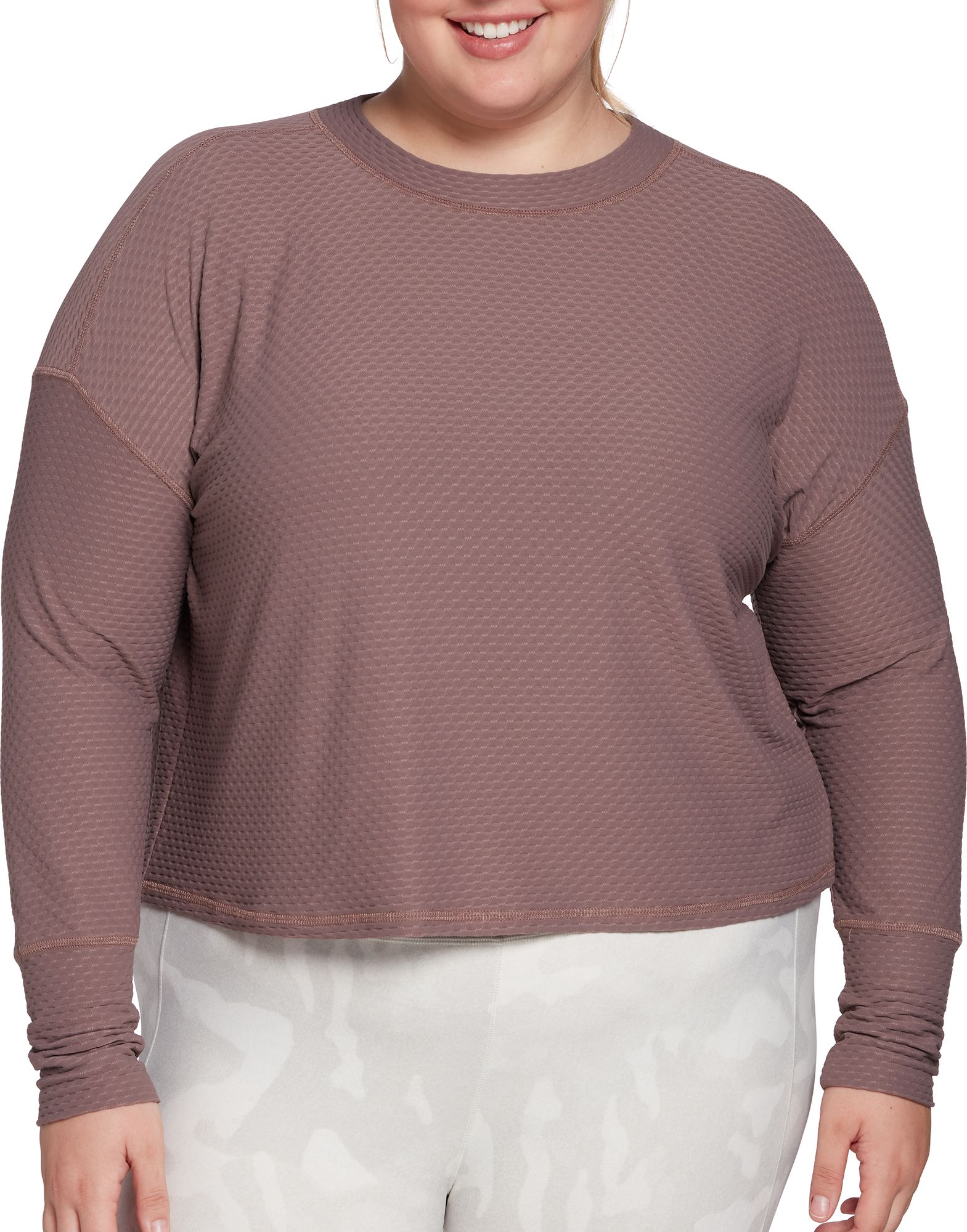 Bought this shirt online and it looks like it has been worn several times at least. Several snags on one of the sleeves and item was visibly unclean. Item did not have original Calia tags on it. Very disappointed that Dicks would send this out as a new, undamaged and unworn item. To be fair every other item in my order in the CALIA collection was in fine condition with this exception. This shirt is cropped. Doesn't run quite as large as some CALIA tops/sweatshirts do. I have this top in several other colors and wear them often.