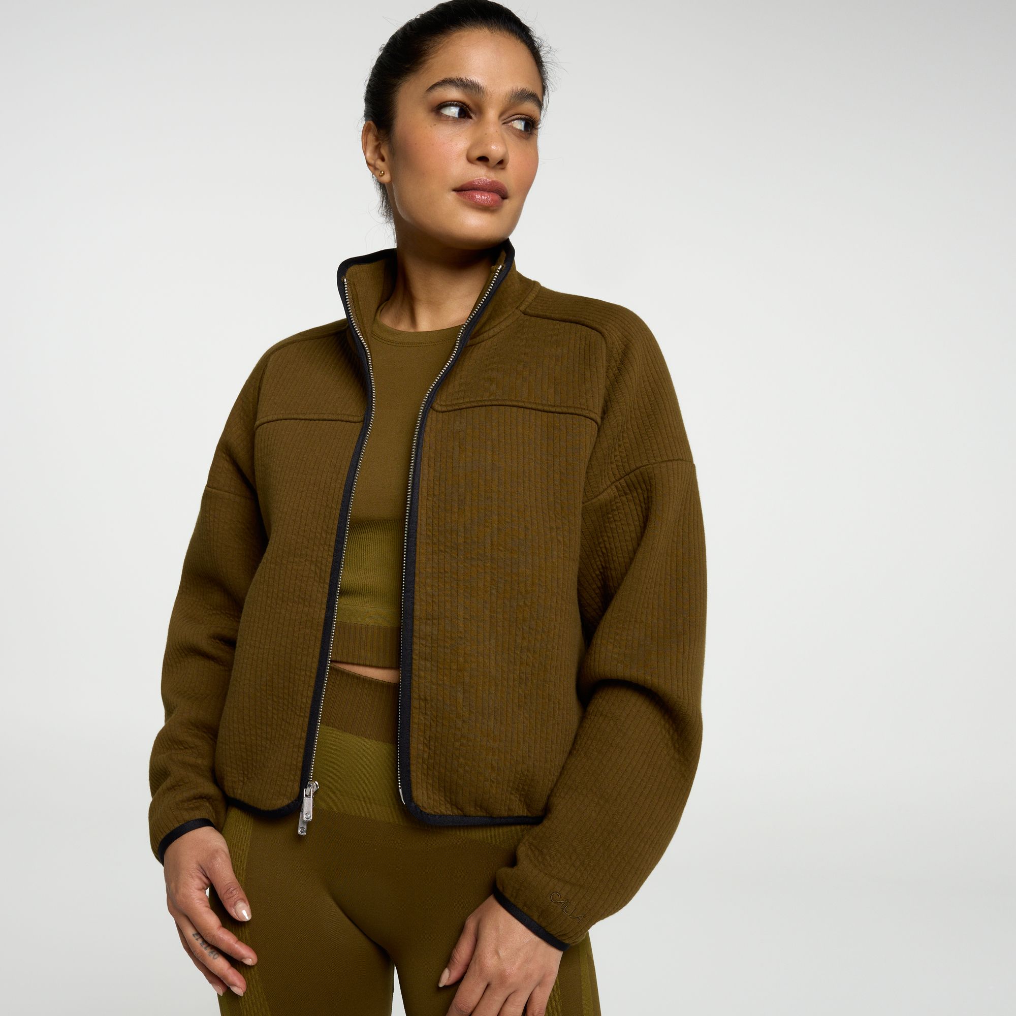 I am just loving everything I've gotten from the Calia brand! I'm also loving that I can get beautiful jackets and pants in the same color to make up a set, and that there are several different styles of pants to choose from. Every now and then the sizing is off on some things, and often the jackets run a size large, but I don't really care what's printed on the label once I get the size that fits! My bust is 38" and waist 30", and the medium fits perfectly - slightly oversized just like the photo. I'm only 5'4", and the sleeve hem is narrow enough to keep them from hanging over my hands or feeling too long. Anyway, all the Calia sets I've bought just look lush and expensive, and continue looking new with gentle washing and hanging to air dry. I do have to use a steamer after the first wash to remove the packing fold lines, but only that one time. I just can't say enough about how beautiful this jacket (and matching scuba joggers) are, esp since I'm a 62 yr old athletic woman who wants grown-up casual wear that still suits my lifestyle. Highly recommended!