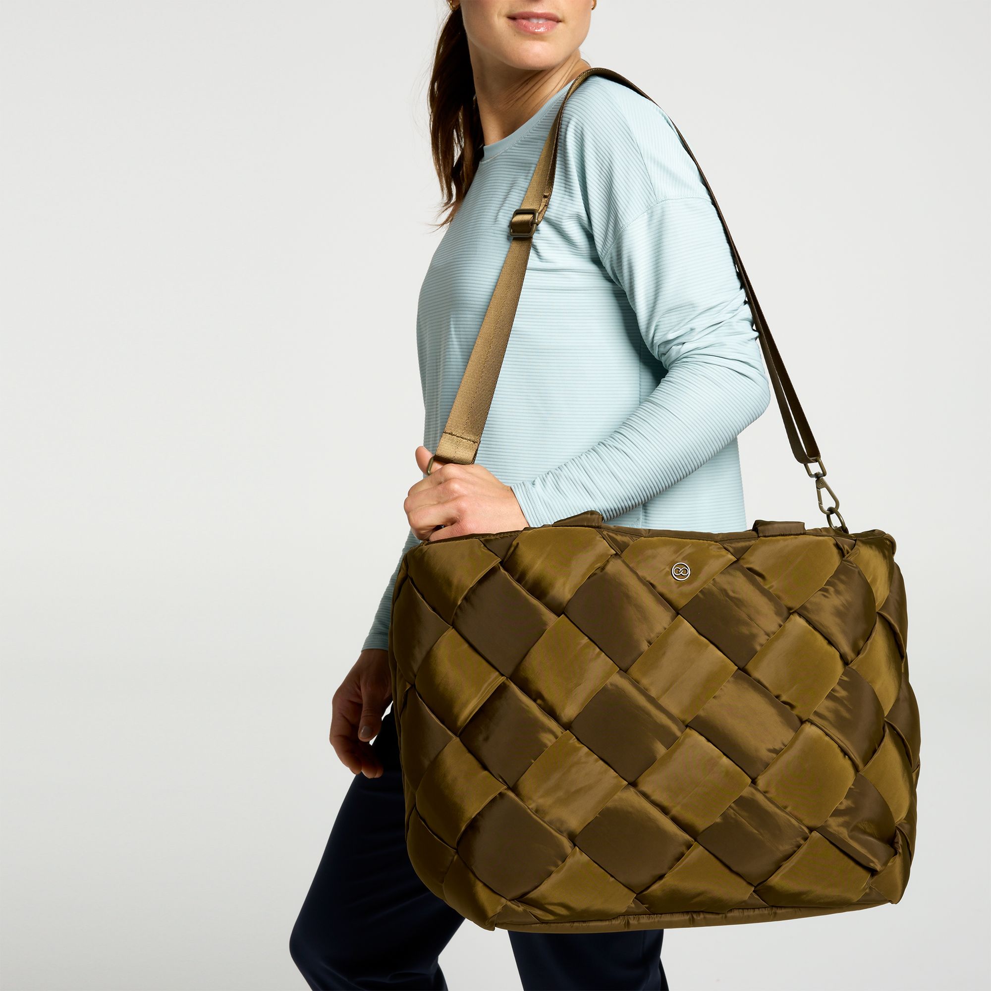 Effortlessly balance style and functionality with the CALIA Women's Luxe Travel Tote Bag. Designed with soft poly fabrication and a chic woven front panel, this tote is perfect for both casual outings and athletic adventures. Featuring an adjustable, detachable crossbody strap, multiple zippered pockets, and a padded laptop sleeve, it ensures you're always organized and travel-ready.