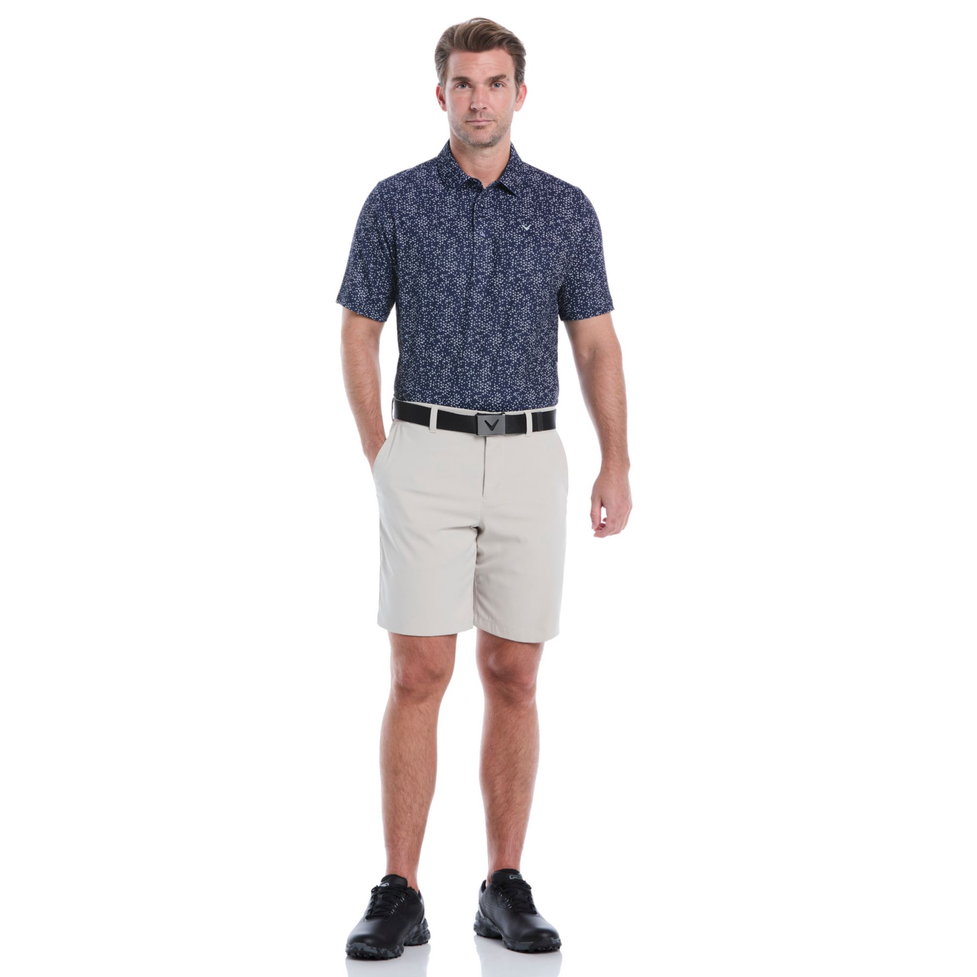 The Callaway men's golf shirt combines style and sustainability. Made from recycled polyester with a chevron print, this golf polo shirt is a stylish and eco-friendly choice. Made with Swing Tech™, this golf shirt also offers a full range of motion to help optimize your game. The lightweight, single knit fabric is comfortable to wear while the all-over chevron print adds a modern touch. With short sleeves, ventilation and moisture-wicking tech, this golf top is perfect for warm days on the course.