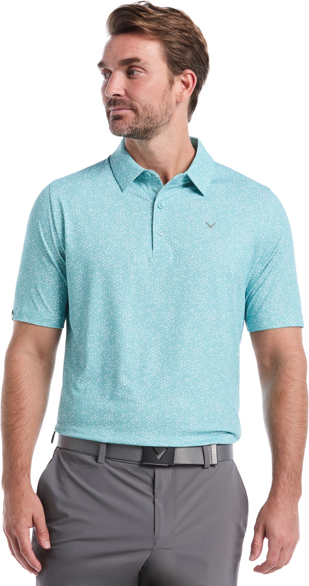 The Callaway men's golf shirt combines style and sustainability. Made from recycled polyester with a chevron print, this golf polo shirt is a stylish and eco-friendly choice. Made with Swing Tech™, this golf shirt also offers a full range of motion to help optimize your game. The lightweight, single knit fabric is comfortable to wear while the all-over chevron print adds a modern touch. With short sleeves, ventilation and moisture-wicking tech, this golf top is perfect for warm days on the course.