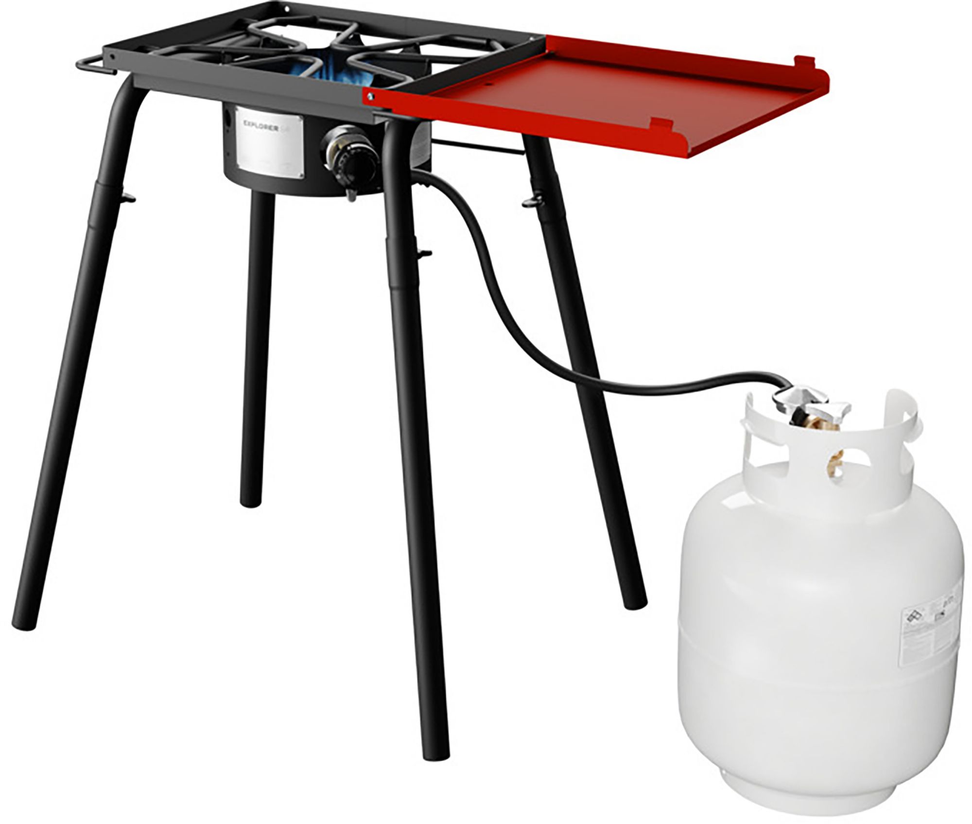 The Camp Chef® Pro 30 Single Burner Stove is a rugged, durable and heavy-duty stove designed to cook with power. A foldable side-shelf attached to the stove provides a preparation area and conveniently holds your cooking tools and seasonings. The 30,000 BTU single burner stove is designed to hold most Camp Chef® single burner accessories. Includes regulator with 3’ hose attachment.
