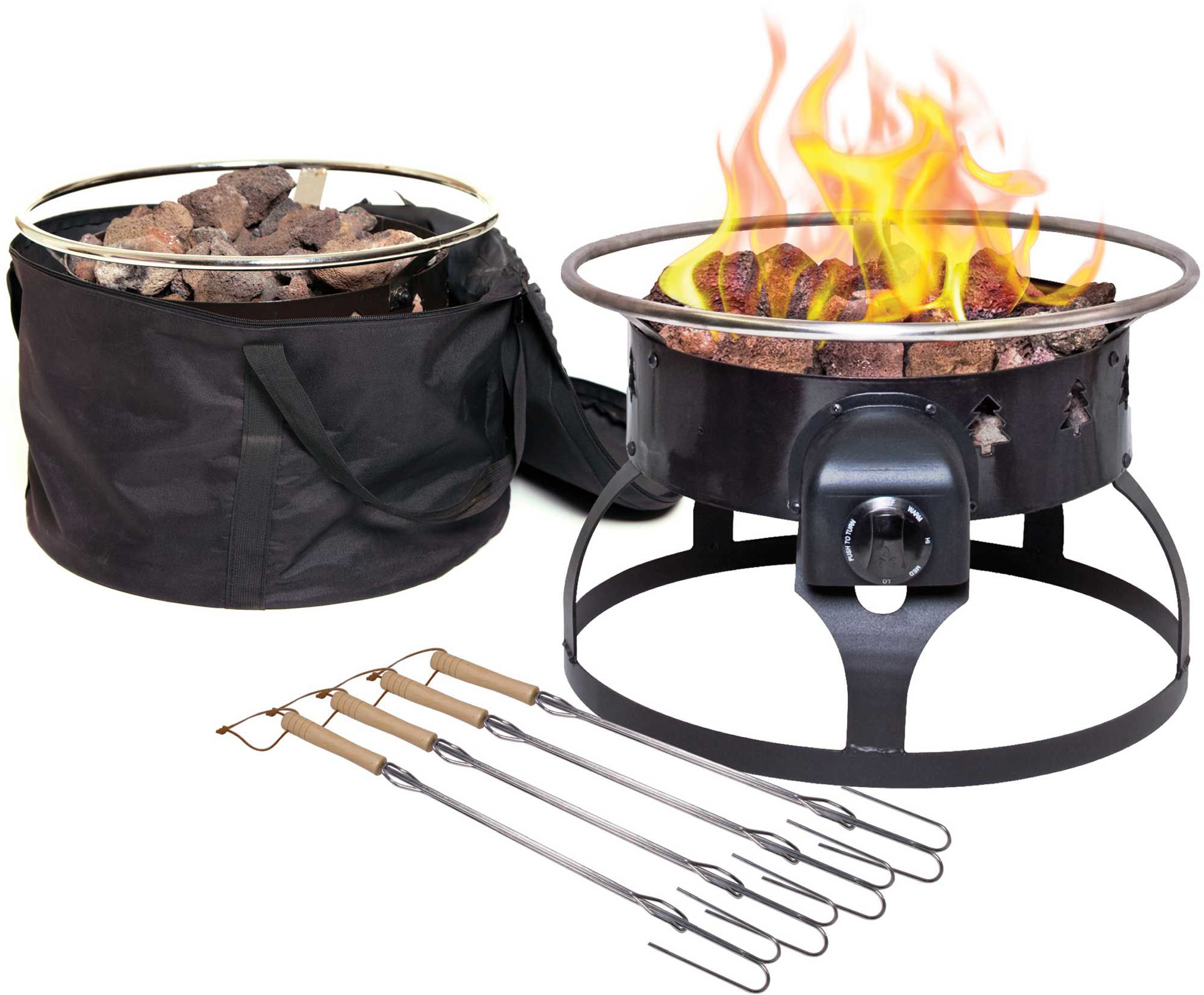 Stay warm and cozy at the campsite, tailgate, or in your own backyard with the Camp Chef Redwood Fire Pit. This propane gas fire pit has a smoke-less flame and matchless ignition for ease of use. With the easily adjustable flame-control dial and included extendable roasting sticks, you can cook the perfect marshmallow or hot dog.