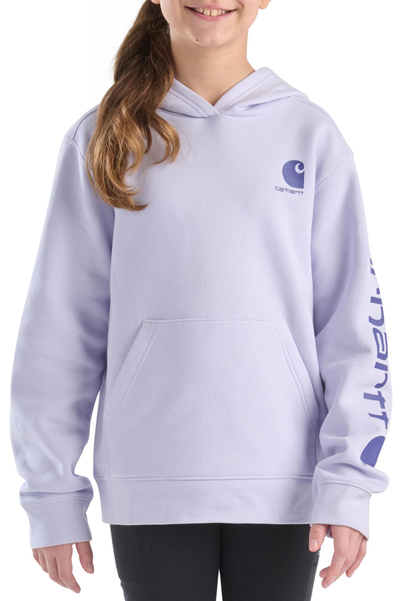 Girls of all ages will dig this long-sleeve sweatshirt's cozy warmth and versatile style. Made from fleece with all the durability and dependability you expect from Carhartt, this pullover has a full hood for extra coverage and a big front pocket for stuff.