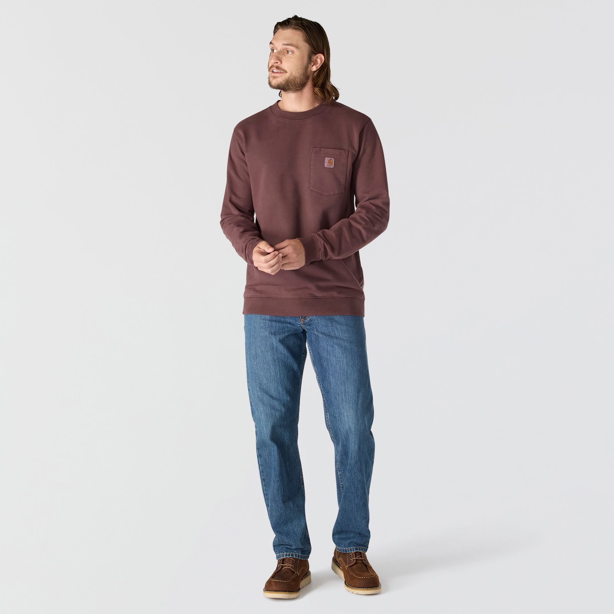 This men's French terry crewneck sweatshirt is garment-dyed for a worn-in, vintage look that only gets better with time. Built to last from midweight all-cotton French terry with a relaxed fit. Featuring a Carhartt label on the chest pocket.