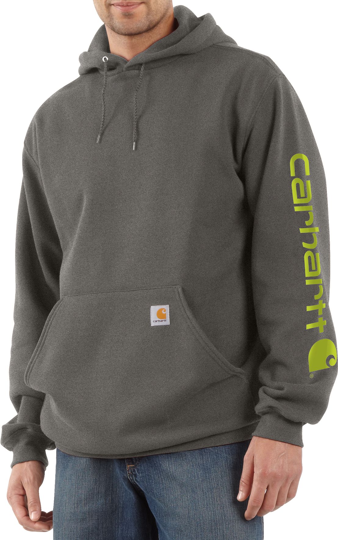 Wear the Carhartt® Men’s Midweight Sleeve Logo Hoodie while you grill your hard-earned venison. Spandex-reinforced rib-knit cuffs and waistband trap heat and allow freedom of movement. You can adjust the hoodie via the draw cord closure. Warm your hands in the front pocket. Cahartt’s logo decorates a patch on the front pocket while “Carhartt” is screen printed on the sleeve.