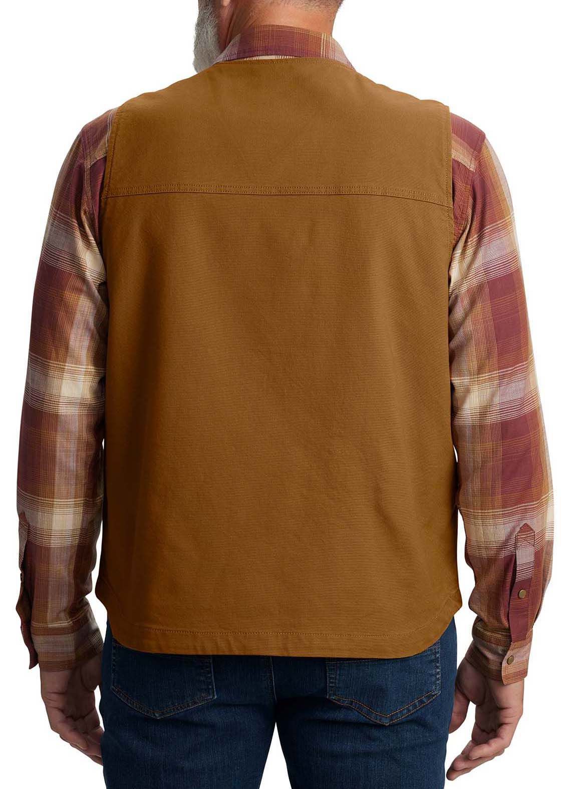 This men's Western vest combines timeless appeal with Carhartt durability. Built to last from rugged, wind-resistant duck fabric with a soft flannel lining and relaxed fit. Featuring six total pockets, including an interior pocket with a zip.