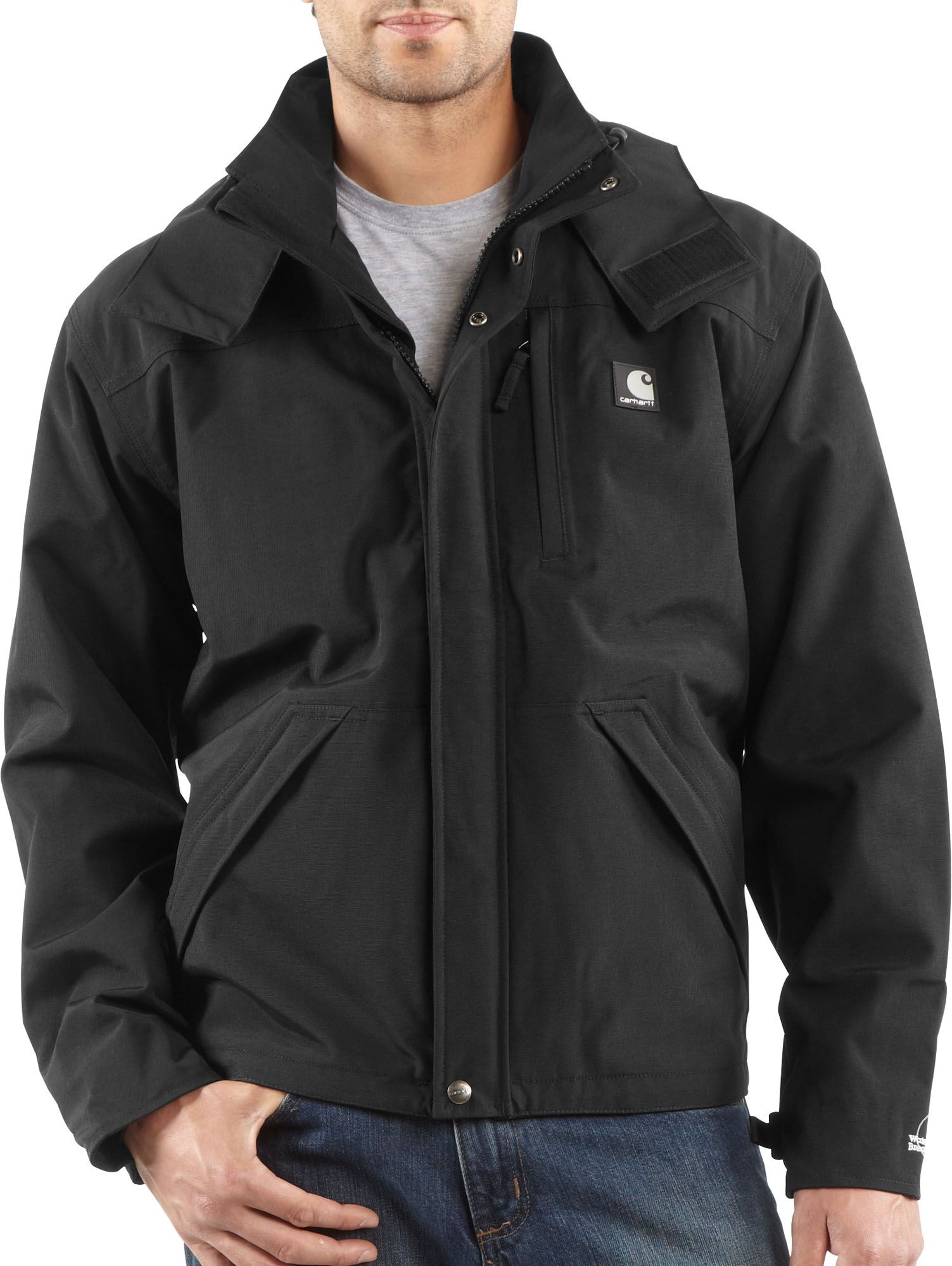 The Carhartt® Men’s Shoreline Jacket will protect you from rain, mud and snow. It will keep you warm, dry and comfortable. A breathable laminated membrane keeps you cool while wicking moisture away. A heavy duty front zipper with double storm flaps and inner sleeve polyester storm cuffs will help keep water out. Includes a snap-on/detachable visored hood with an adjustable draw-cord closure.