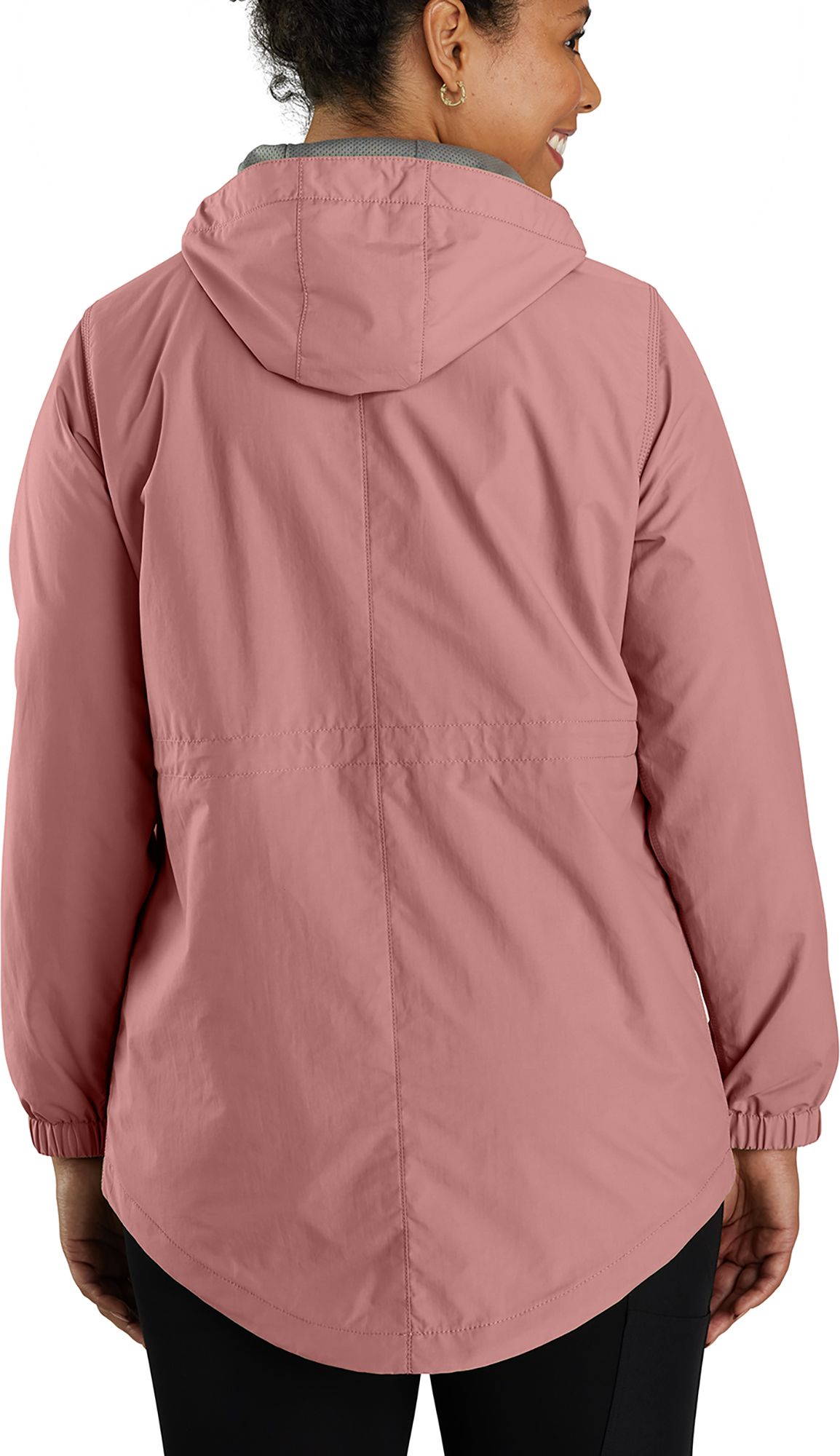 Attached three-piece hood with drawcord and barrel lock adjusters to keep you dry