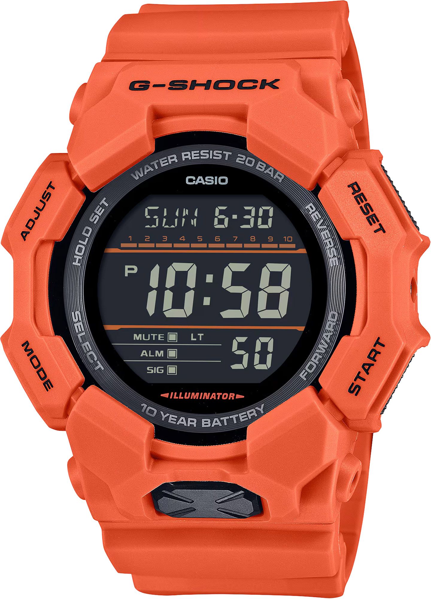 Enjoy a life of fewer battery changes with a large-case G-SHOCK with a 10-year battery you won’t have to worry about for ages. The digital GD010 delivers handy features like world time and stopwatch, as well as a high-brightness LED light, which can be easily accessed from the large button on front of the case, ensuring visibility even in the dark. Made with bio-based resin and equipped with a 10-year battery, this G-SHOCK is great if you want to reduce environmental impact. Available in a selection of black-based workstyle color schemes for a cool design that moves with ease from casual settings to work situations.