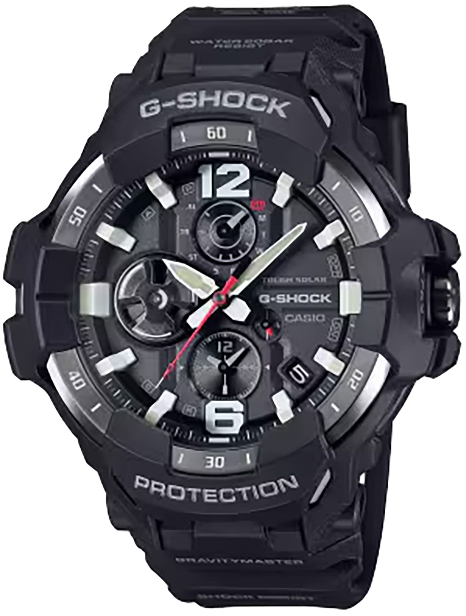 Glancing at your G-SHOCK GRAVITYMASTER pilot watch, you see you left your departure city an hour ago, and the dual time indicates your arrival city is five hours ahead--plenty of time to work through your next maneuver. The large numerals “6” and “12” and the 3-D indices on the face of the G-SHOCK GRB300-1A pilot watch were designed for quick readability, making the glance you gave your watch all that was needed to maximize your focus and attention during flight.