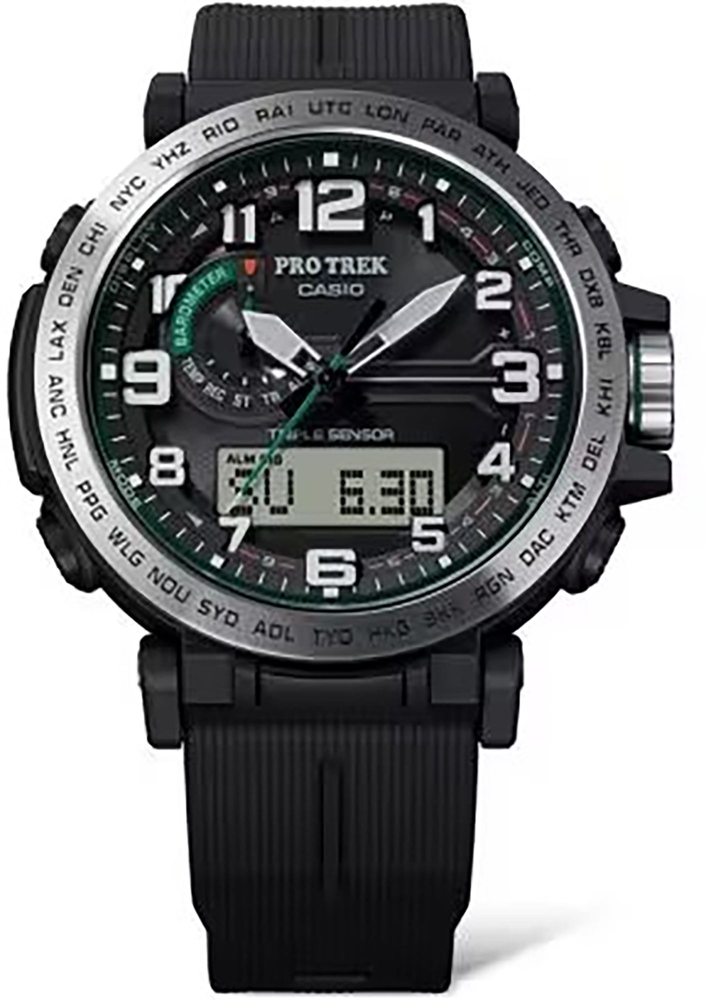 Go bold. Explore the great outdoors! Get the PRO TREK PRG-601 featuring materials expected to reduce environmental impact and big bold index numbers.The digital compass, barometer/altimeter, and thermometer Triple Sensor helps you stay on top of changes in the natural environment, while Tough Solar converts light into the energy needed to power the watch.