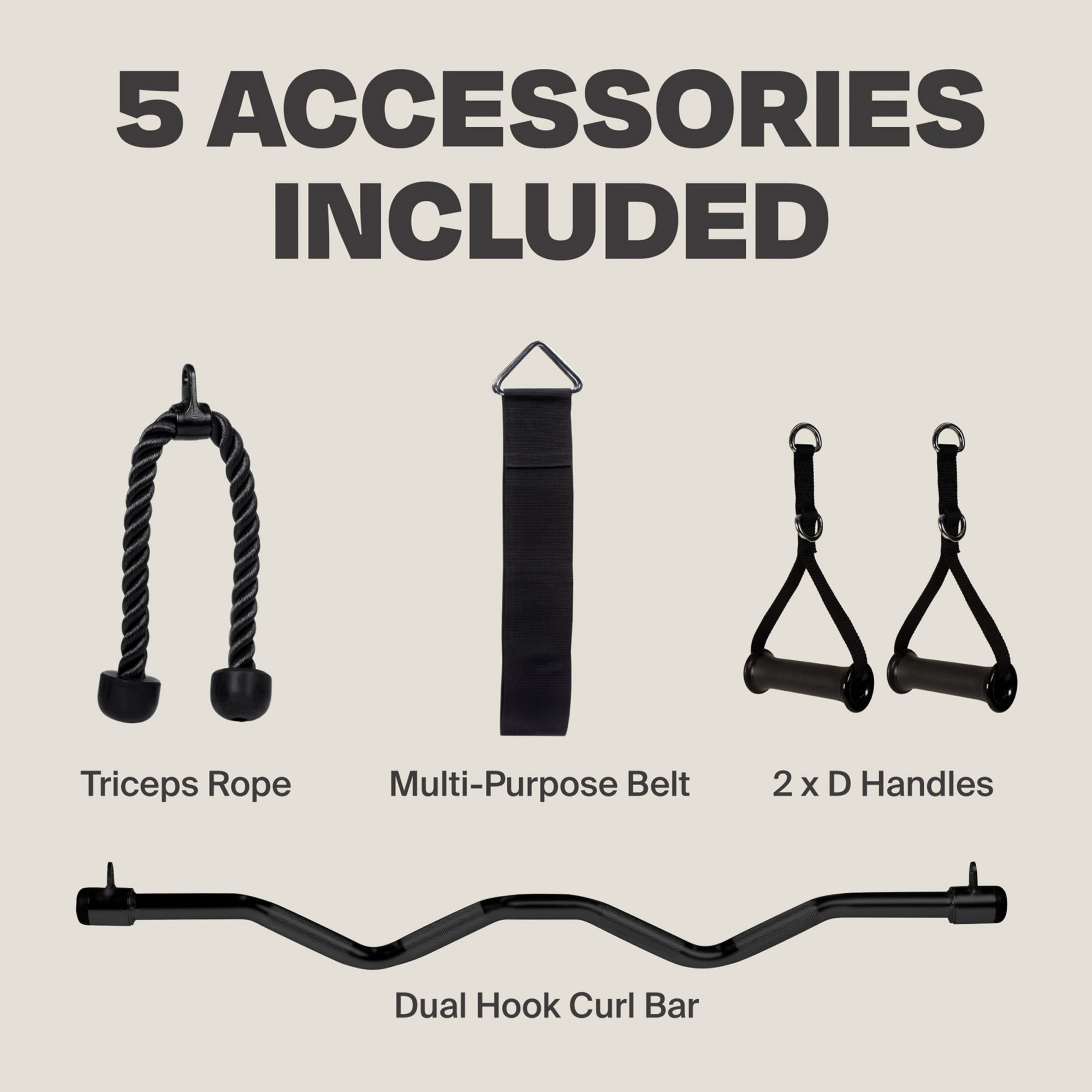 | Included Accessories: | Two (2) Dual Ring Soft Strap D-Handles, EZ Curl Bar, Triceps Rope, and Multipurpose Belt |