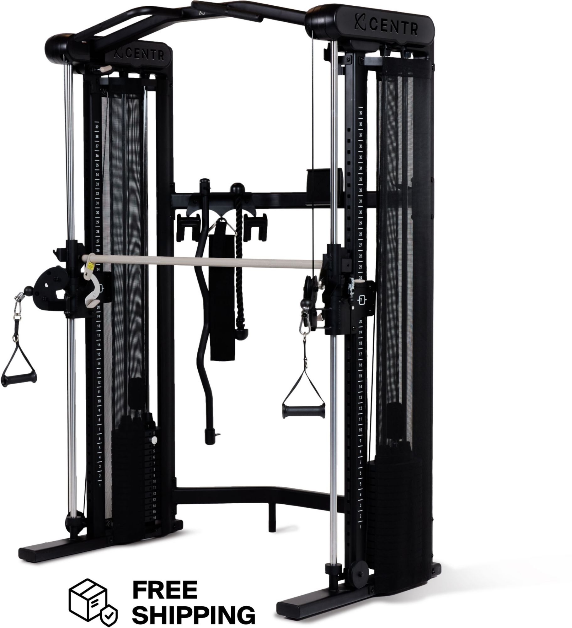 This ultimate two-in-one home gym combines a functional cable machine for dynamic movements and a Selectorized Smith Machine for traditional exercises, all in one streamlined design. Centr 3 is equipped with two 165 lb pin loaded weight stacks (330 lb in total), and our smooth-gliding pulley system for frictionless movements. The two adjustable swivel pulleys offer 30 unique vertical positions and when combined with the superior travel distance of the cables, there's almost no dynamic movement or resistance training exercise you can’t do on this machine.