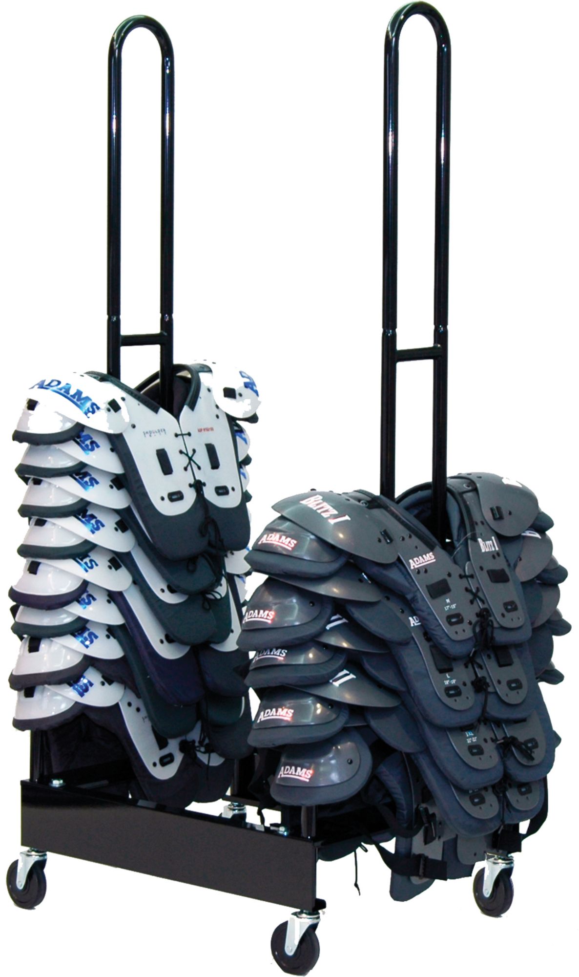 Save time and space with the Champion Sports 2 Stack Shoulder Pad Rack. This two-stack tubular rack has a reinforced steel base and can hold up to 30 shoulder pads. Four heavy-duty swivel casters allow for easy transport from the field or gym. The Champion Sports 2 Stack Shoulder Pad Rack will turn any space into the clutter-free area athletes deserve.