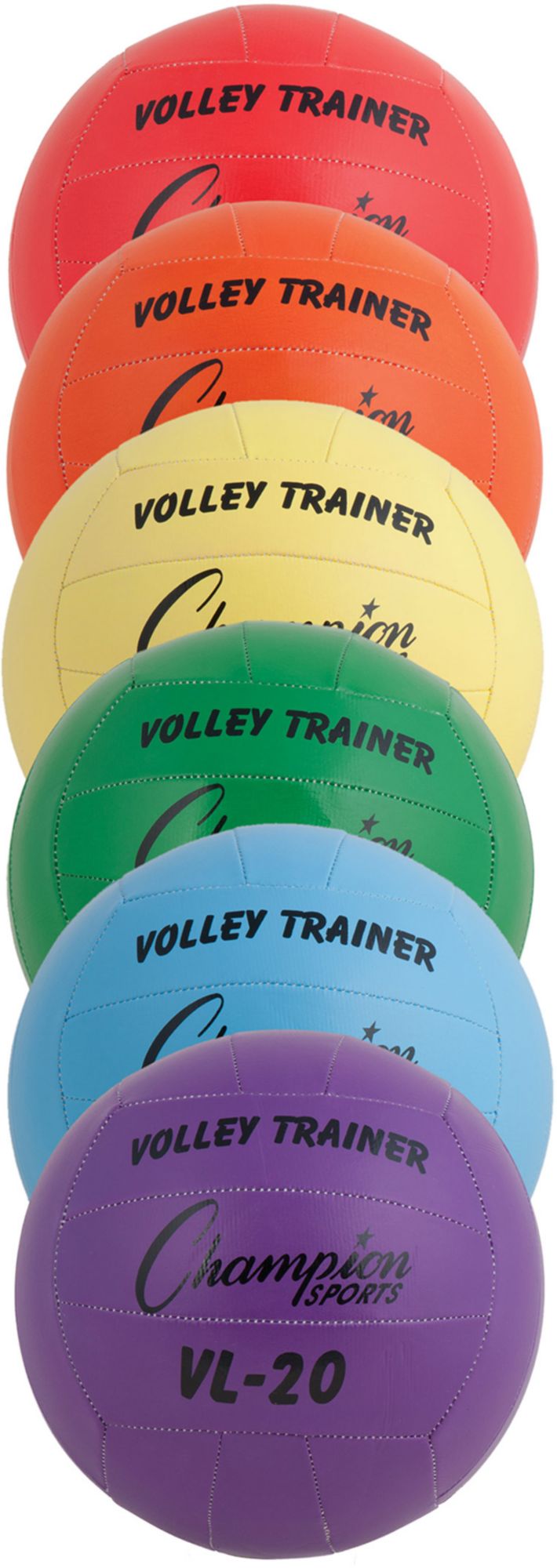 Prepare for your next big match with the Champion® Volleyball Trainer Set. This set of six rainbow colored balls keeps you dialed in for every serve. The soft hand vinyl covered nylon and tough rubber bladder deliver a more cushioned feel without sacrificing durability. Set yourself up for success with the 18-panel design and regulation size of these volleyballs. Best of all, with 20 percent less weight, you’re able to train all day long.