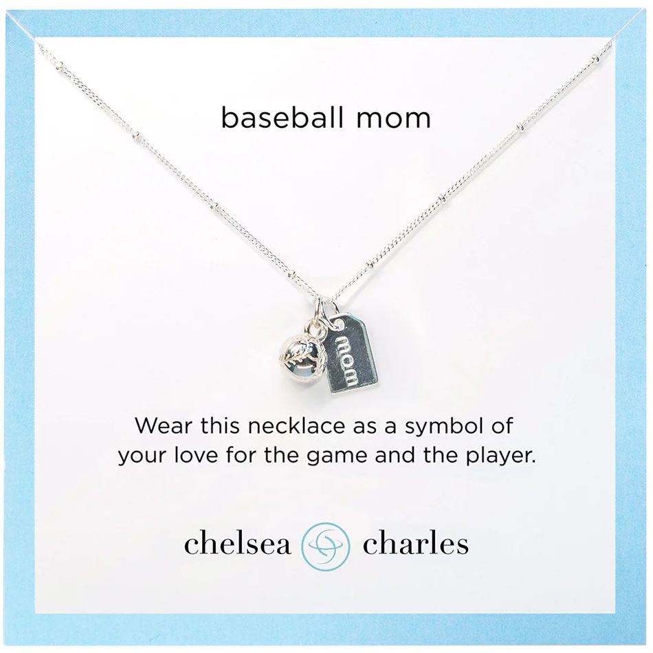 Designed for the devoted baseball mom, wear this jewelry as a symbol of your love for the game and your favorite player. Sterling silver plated baseball charm (8mm) and reversible "mom" tag on sterling silver, 18" chain. Dainty baseball earrings are sterling silver plated, featuring sterling silver, hypoallergenic post
