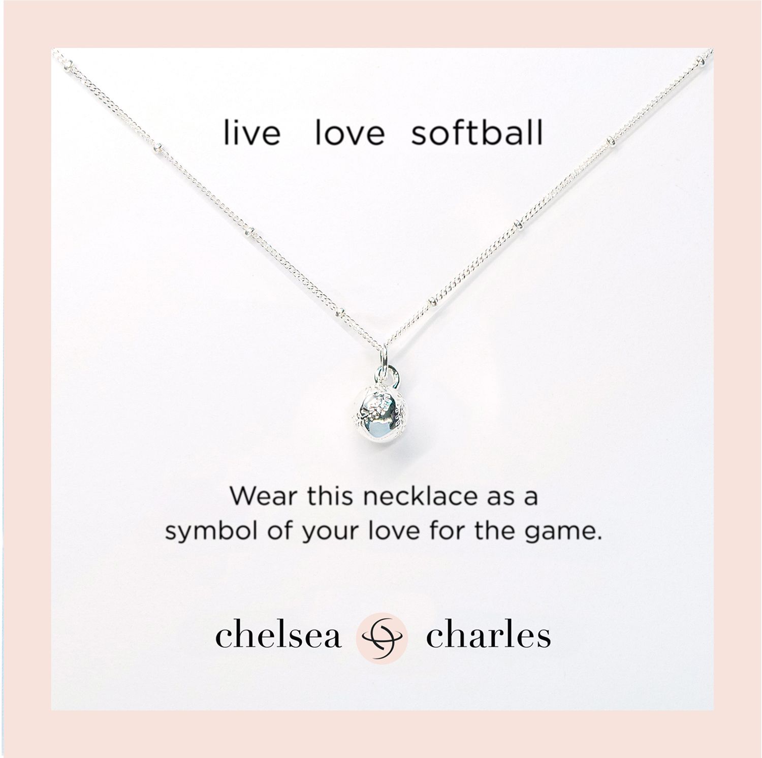 This beautiful, child-sized necklace features a mini sterling silver plated softball charm on a 16" sterling silver chain. Hypoallergenic; recommended for ages 5-11. Designed by Chelsea Charles, a brand specializing in jewelry and accessories for the stylish athlete.