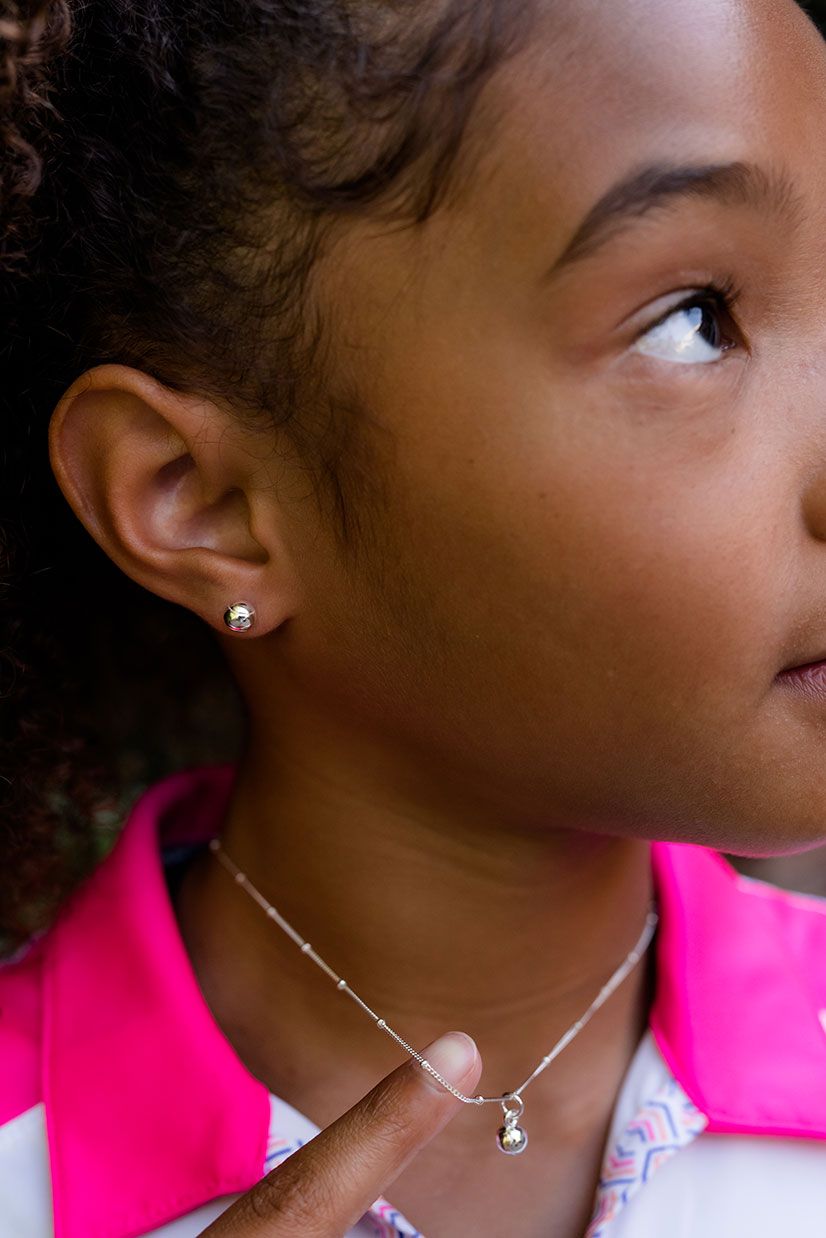 This beautiful, child-sized gift set features a mini sterling silver tennis ball charm (6mm) on a 16" sterling silver chain paired with 6mm tennis ball earrings. Our signature earring backings are specially designed for the comfort of little ears. A perfect gift for any young player or fan. Hypoallergenic; recommended for ages 5-11.