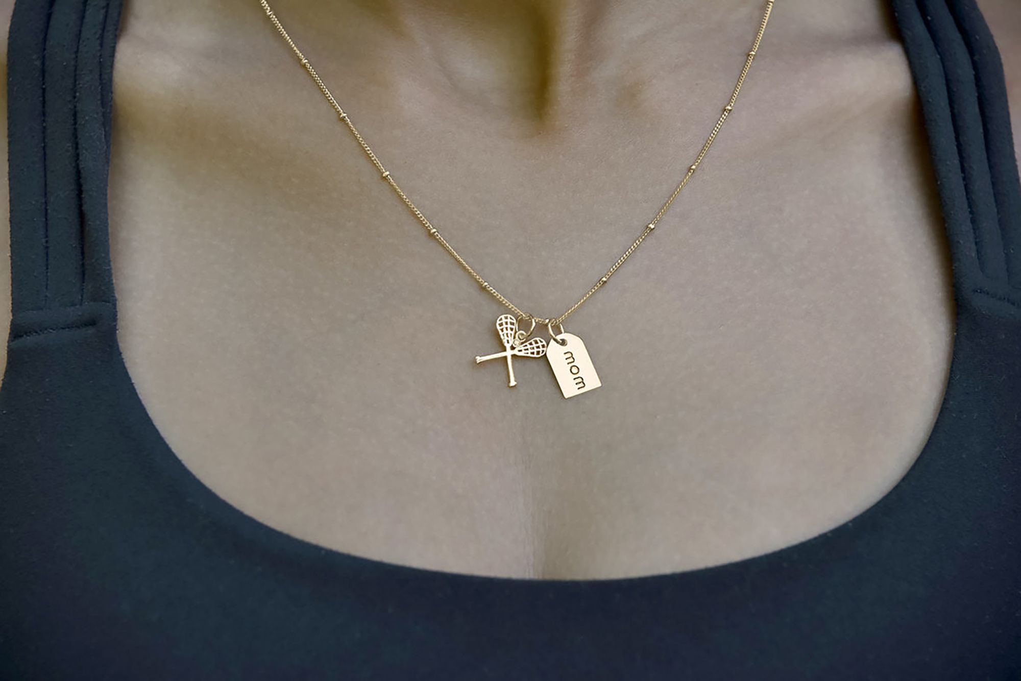 Designed especially for the devoted lacrosse mom, wear this necklace as a symbol of your love for the game and the player. Sterling silver or 14k gold plated lacrosse sticks and man made diamond "lacrosse ball" charm with a reversible "mom" mini tag on an 18" chain.
