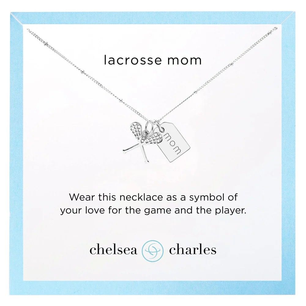 Designed especially for the devoted lacrosse mom, wear this necklace as a symbol of your love for the game and the player. Sterling silver or 14k gold plated lacrosse sticks and man made diamond "lacrosse ball" charm with a reversible "mom" mini tag on an 18" chain.