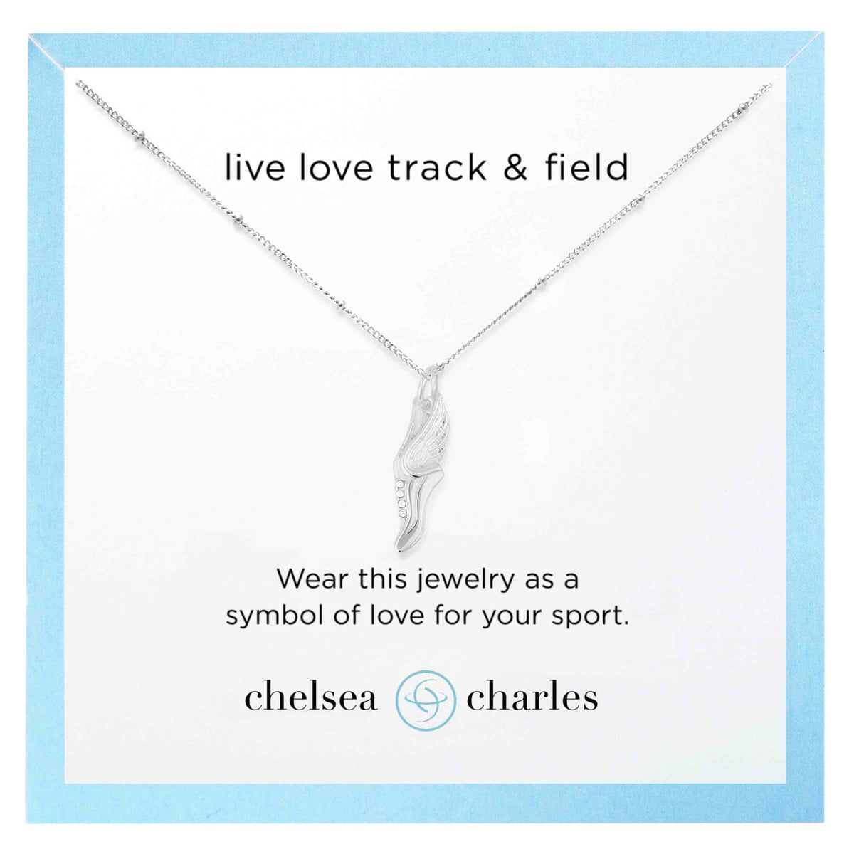 Wear this necklace as a symbol of your love for track and field. Sterling silver plated, 16" necklace features a sterling silver plated, winged running shoe charm with crystal shoelace holes. Spring ring closure and logo at the clasp. Comes ready to gift on our jewelry stationery.