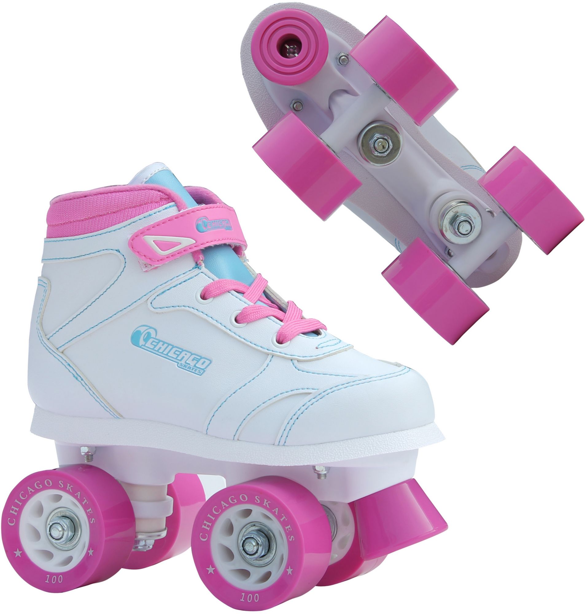With its athletic style design and girly colors, the Chicago® Girls’ Sidewalk Roller Skates offer young skaters the details needed in a first-time skate. Featuring Tigalon 3/4 boots with padded ankle collars and secure laces and Velcro ® Power Strap closures, little feet will be held snugly in place for a solid and supportive ride. Oversized PVC spoke hubs, 60mm composite wheels and toe stop add the stability little skaters need.