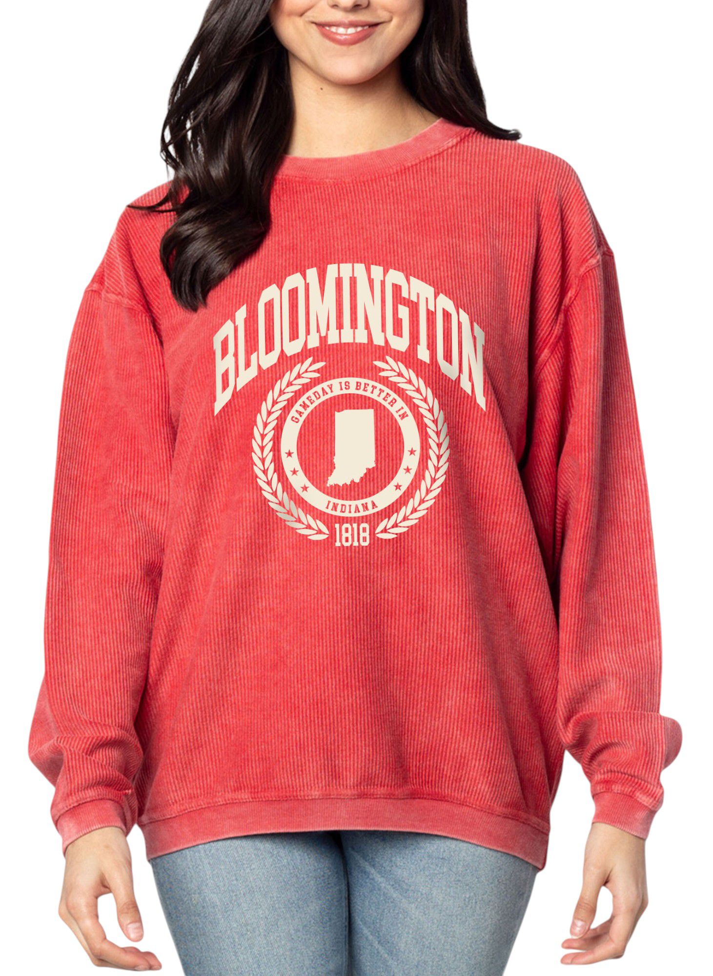 chicka-d Women's Bloomington Red College Graphic Crew Pullover Sweatshirt
