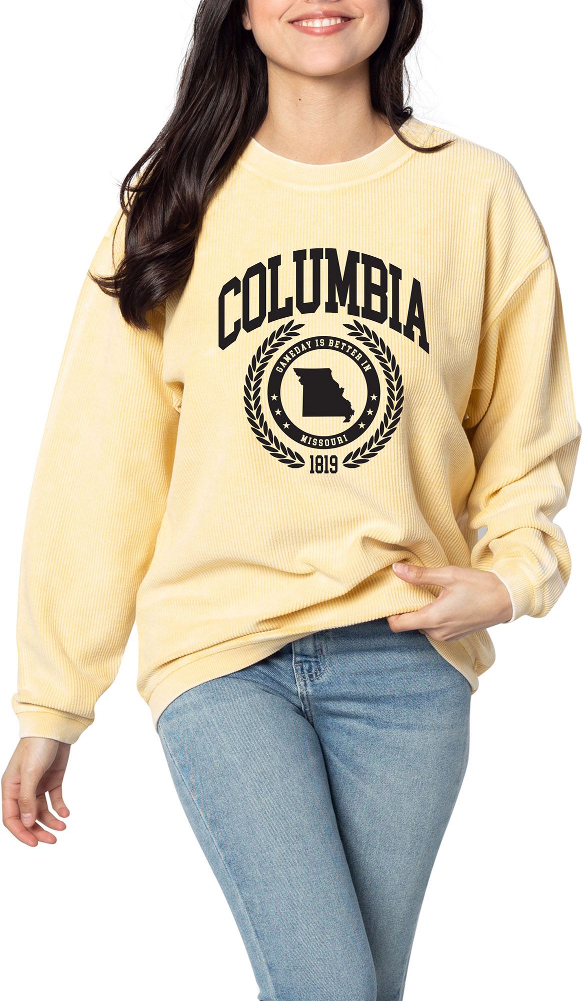 chicka-d Women's Columbia Yellow College Graphic Crew Pullover Sweatshirt