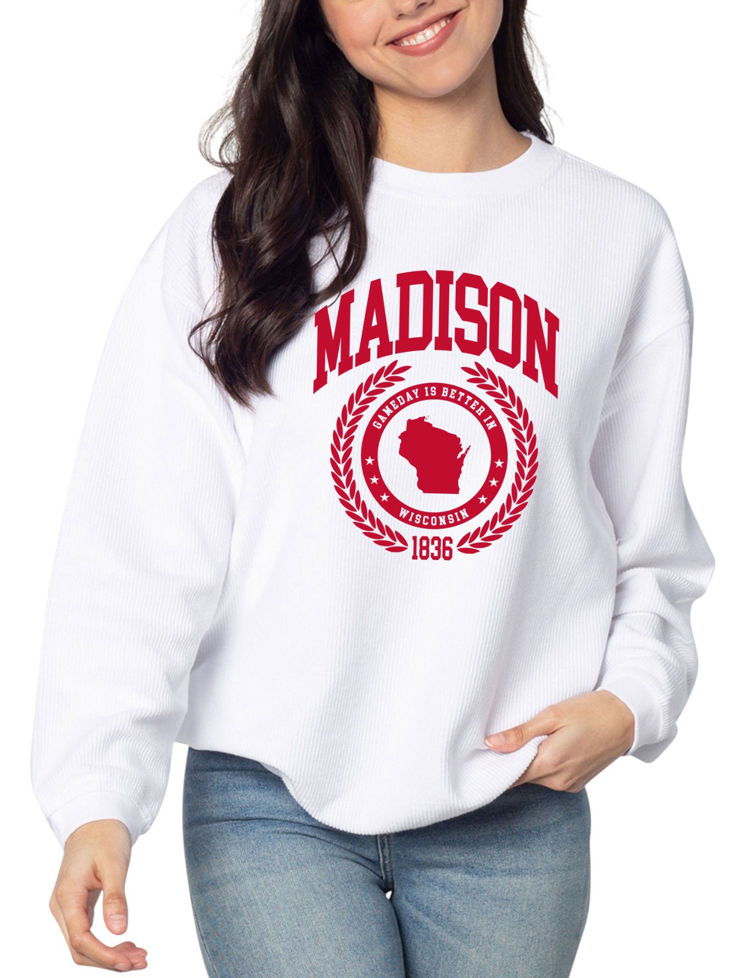 chicka-d Women's Madison White College Graphic Crew Pullover Sweatshirt