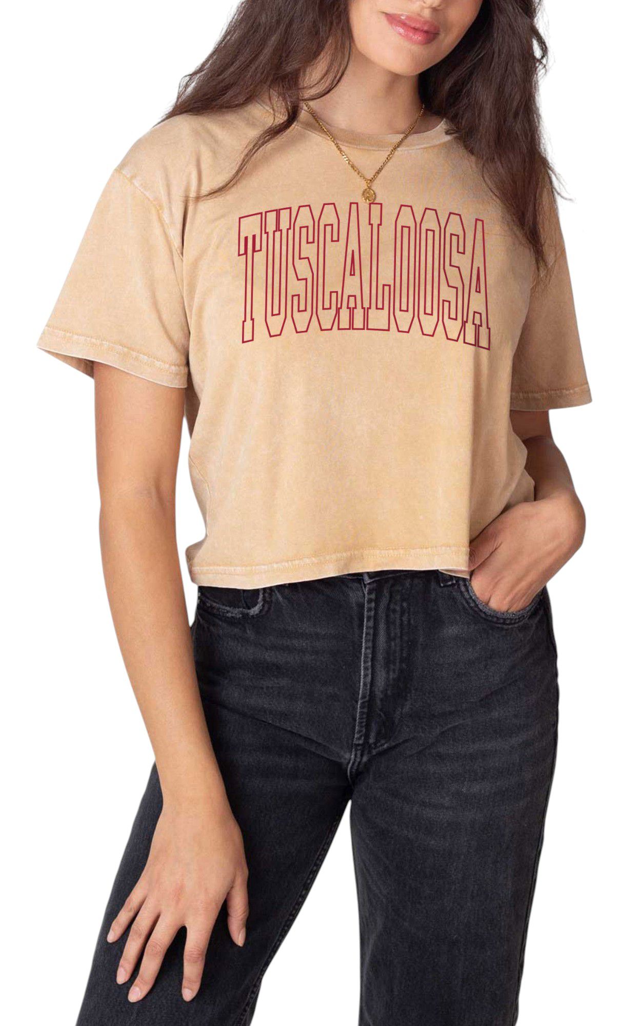chicka-d Women's Tuscaloosa Tan College Arch Crop T-Shirt