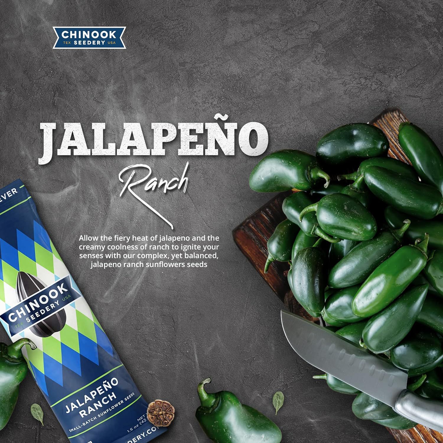 What happens when you combine perfectly roasted sunflower seeds with the heat of jalapeño and the creamy coolness of ranch dressing? Pure magic, that's what. Created for the true seed aficionado, Chinook's new Jalapeño Ranch flavor is complex yet balanced. You're welcome in advance.